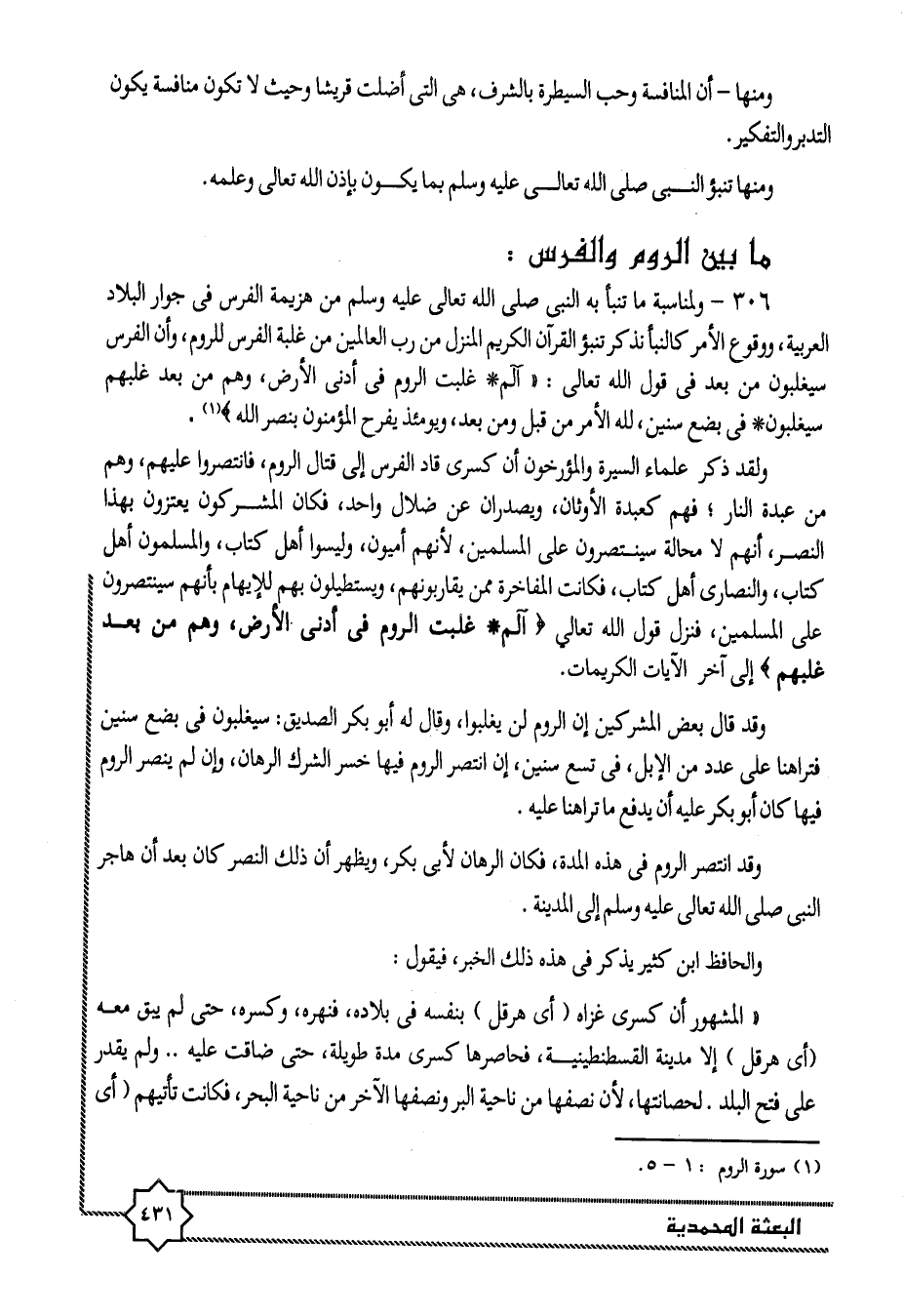 306- ولمناسبة ما تنبأ به النبى صلى الله تعالى عليه وسلم من هزيمة الفرس فى جوار البلاد العربية، ووقوع الأمر كالنبأ نذكر تنبؤ القران الكريم المنزل من رب العالمين من غلبة الفرس للروم، وأن الفرس سيغلبون من بعد فى قول الله تعالى: «الم. غُلِبَتِ الرُّومُ فِي أَدْنَى الْأَرْضِ، وَهُمْ مِنْ بَعْدِ غَلَبِهِمْ سَيَغْلِبُونَ. فِي بِضْعِ سِنِينَ، لِلَّهِ الْأَمْرُ مِنْ قَبْلُ وَمِنْ بَعْدُ، وَيَوْمَئِذٍ يَفْرَحُ الْمُؤْمِنُونَ بِنَصْرِ اللَّهِ «1» .
