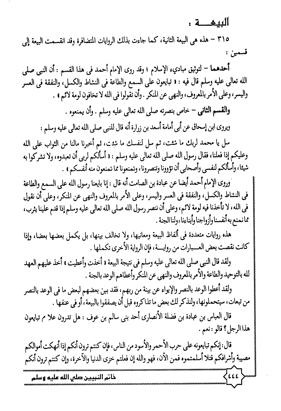 315- هذه هى البيعة الثانية، كما جاءت بذلك الروايات المتضافرة وقد انقسمت البيعة إلى قسمين: