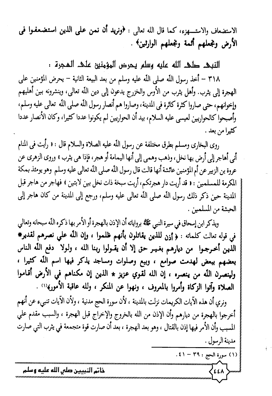 318- أخذ رسول الله صلى الله عليه وسلم من بعد البيعة الثانية- يحرض المؤمنين على الهجرة إلى يثرب. وأهل يثرب من الأوس والخزرج يدعون إلى دين الله تعالى، وينشرونه بين أهليهم وإخوانهم، حتى صاروا كثرة كاثرة فى المدينة، وصاروا هم أنصار رسول الله صلى الله تعالى عليه وسلم، وأصبحوا كالحواريين لعيسى عليه السلام، بيد أن الحواريين لم يكونوا عددا كثيرا، وكان الأنصار عددا كثيرا من بعد.