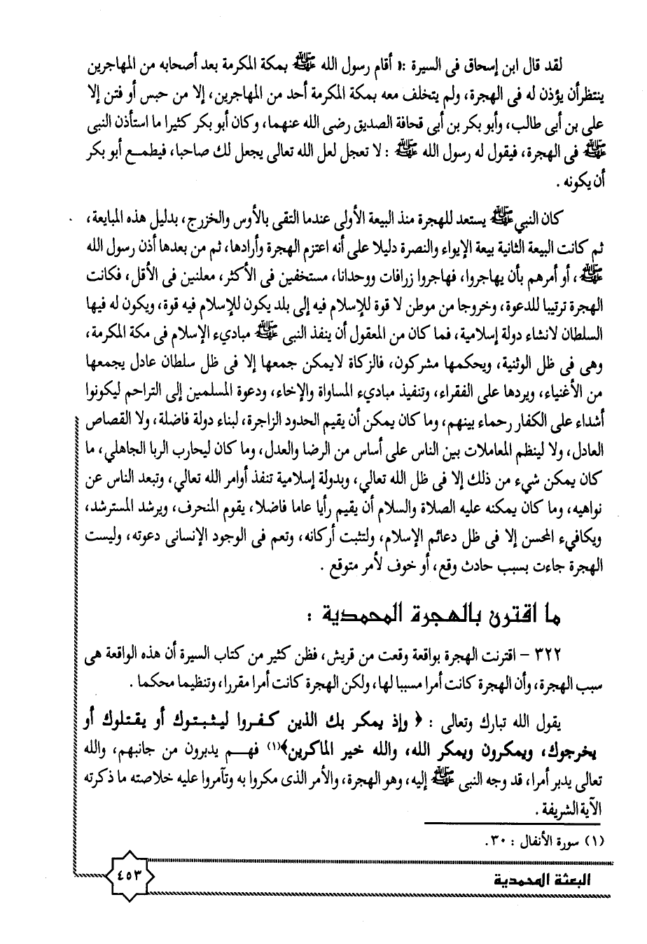 322- اقترنت الهجرة بواقعة وقعت من قريش، فظن كثير من كتاب السيرة أن هذه الواقعة هى سبب الهجرة، وأن الهجرة كانت أمرا مسببا لها، ولكن الهجرة كانت أمرا مقررا، وتنظيما محكما.