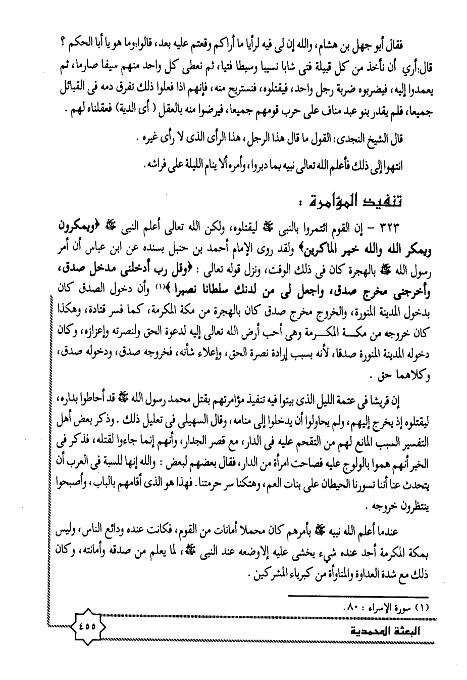 323- إن القوم ائتمروا بالنبى صلّى الله عليه وسلّم ليقتلوه، ولكن الله تعالى أعلم النبى صلّى الله عليه وسلّم وَيَمْكُرُونَ وَيَمْكُرُ اللَّهُ وَاللَّهُ خَيْرُ الْماكِرِينَ ولقد روى الإمام أحمد بن حنبل بسنده عن ابن عباس أن أمر رسول الله صلّى الله عليه وسلّم بالهجرة كان فى ذلك الوقت، ونزل قوله تعالى: وَقُلْ رَبِّ أَدْخِلْنِي مُدْخَلَ صِدْقٍ، وَأَخْرِجْنِي مُخْرَجَ صِدْقٍ، وَاجْعَلْ لِي مِنْ لَدُنْكَ سُلْطاناً نَصِيراً «1» وأن دخول الصدق كان بدخول المدينة المنورة، والخروج مخرج صدق كان بالهجرة من مكة المكرمة، كما فسر قتادة، وهكذا كان خروجه من مكة المكرمة وهى أحب أرض الله تعالى إليه لدعوة الحق ولنصرته وإعزازه، وكان دخوله المدينة المنورة صدقا، لأنه بسبب إرادة نصرة الحق، وإعلاء شأنه، فخروجه صدق، ودخوله صدق، وكلاهما حق.