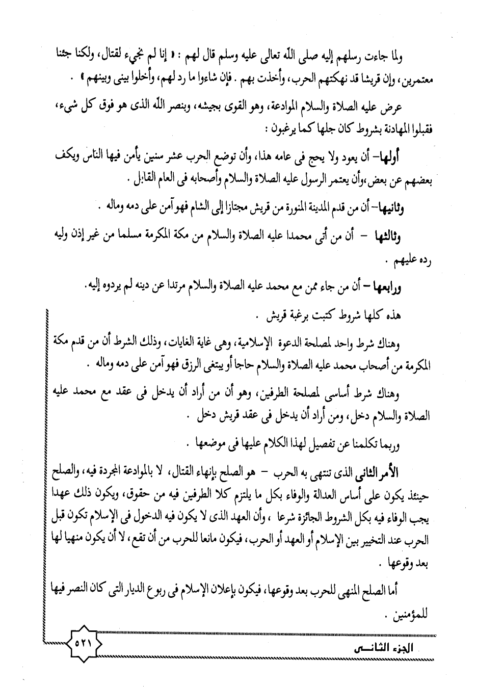 الأمر الثانى الذى تنتهى به الحرب- هو الصلح بإنهاء القتال، لا بالموادعة المجردة فيه، والصلح حينئذ يكون على أساس العدالة والوفاء بكل ما يلتزم كلا الطرفين فيه من حقوق، ويكون ذلك عهدا يجب الوفاء فيه بكل الشروط الجائزة شرعا، وأن العهد الذى لا يكون فيه الدخول في الإسلام تكون قبل الحرب عند التخيير بين الإسلام أو العهد أو الحرب، فيكون مانعا للحرب من أن تقع، لا أن يكون منهيا لها بعد وقوعها.