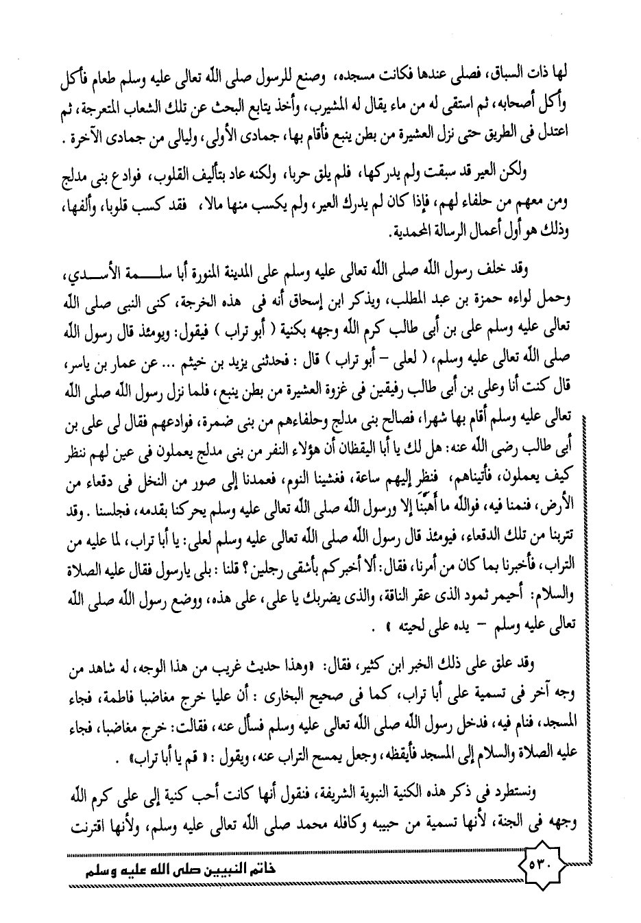 وقد خلف رسول الله صلى الله تعالى عليه وسلم على المدينة المنورة أبا سلمة الأسدي، وحمل لواءه حمزة بن عبد المطلب، ويذكر ابن إسحاق أنه في هذه الخرجة، كنى النبى صلى الله تعالى عليه وسلم على بن أبى طالب كرم الله وجهه بكنية (أبو تراب) فيقول: ويومئذ قال رسول الله صلى الله تعالى عليه وسلم، (لعلى- أبو تراب) قال: فحدثنى يزيد بن خيثم ... عن عمار بن ياسر، قال كنت أنا وعلى بن أبى طالب رفيقين في غزوة العشيرة من بطن ينبع، فلما نزل رسول الله صلى الله تعالى عليه وسلم أقام بها شهرا، فصالح بنى مدلج وحلفاءهم من بنى ضمرة، فوادعهم فقال لى على بن أبى طالب رضى الله عنه: هل لك يا أبا اليقظان أن هؤلاء النفر من بنى مدلج يعملون في عين لهم ننظر كيف يعملون، فأتيناهم، فنظر إليهم ساعة، فغشينا النوم، فعمدنا إلى صور من النخل في دقعاء من الأرض، فنمنا فيه، فو الله ما أهبّنا إلا ورسول الله صلى الله تعالى عليه وسلم يحركنا بقدمه، فجلسنا. وقد تتربنا من تلك الدقعاء، فيومئذ قال رسول الله صلى الله تعالى عليه وسلم لعلى: يا أبا تراب، لما عليه من التراب، فأخبرنا بما كان من أمرنا، فقال: ألا أخبركم بأشقى رجلين؟ قلنا: بلى يا رسول فقال عليه الصلاة والسلام: أحيمر ثمود الذى عقر الناقة، والذى يضربك يا على، على هذه، ووضع رسول الله صلى الله تعالى عليه وسلم- يده على لحيته» .