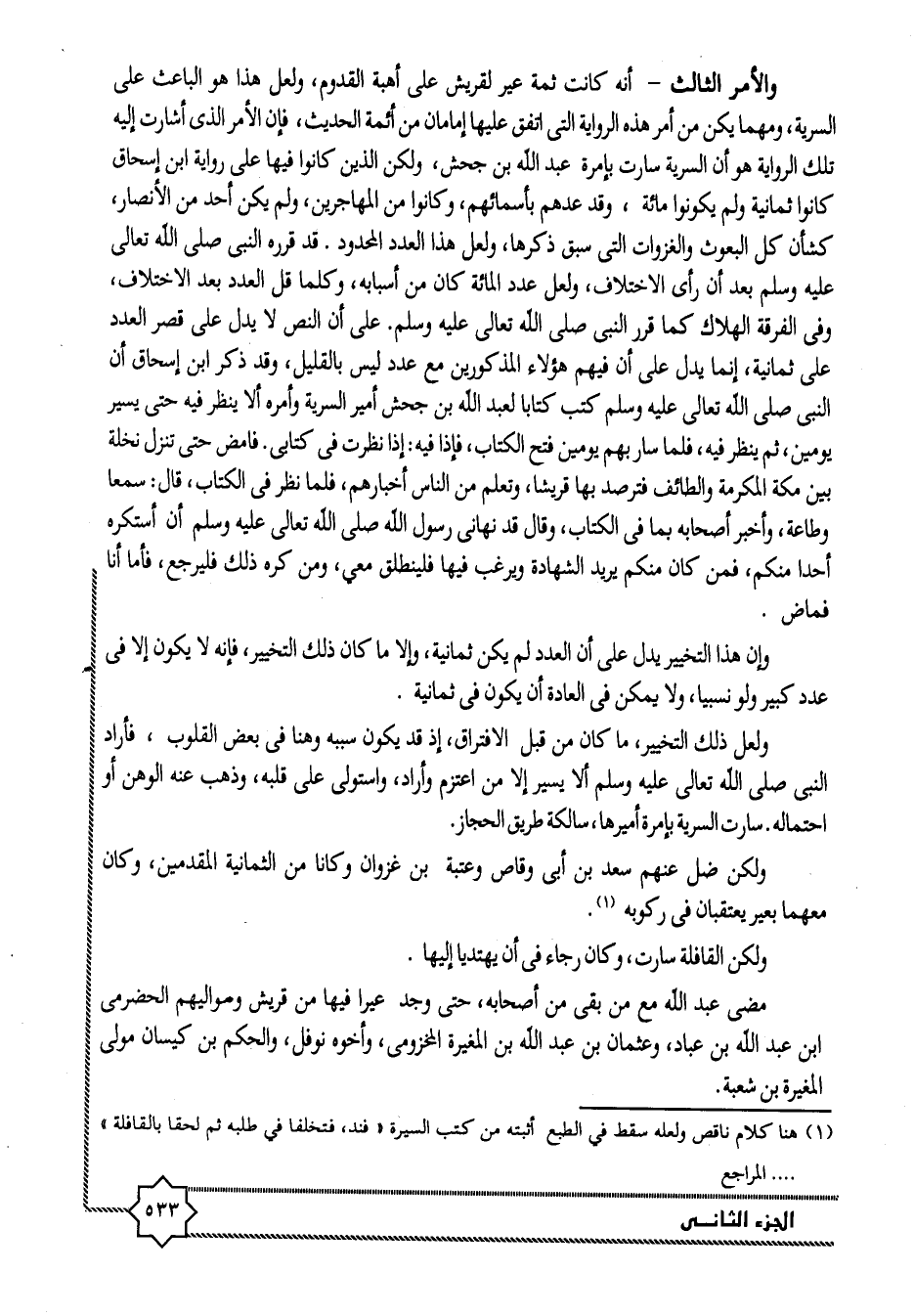 (1) هنا كلام ناقص ولعله سقط في الطبع أثبته من كتب السيرة «فند، فتخلفا في طلبه ثم لحقا بالقافلة» ... المراجع