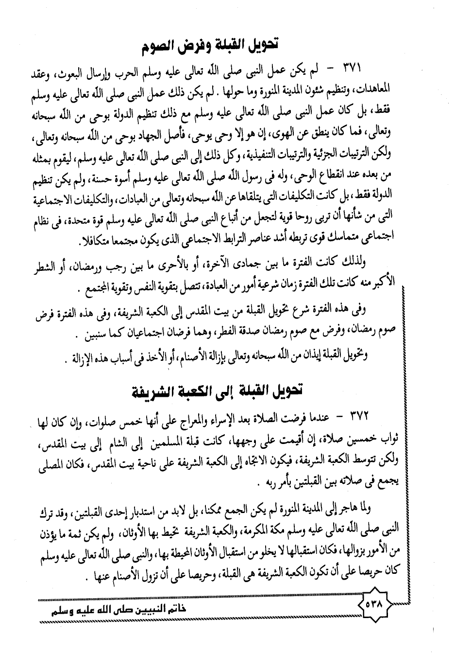 371- لم يكن عمل النبى صلى الله تعالى عليه وسلم الحرب وإرسال البعوث، وعقد المعاهدات، وتنظيم شئون المدينة المنورة وما حولها. لم يكن ذلك عمل النبى صلى الله تعالى عليه وسلم فقط، بل كان عمل النبى صلى الله تعالى عليه وسلم مع ذلك تنظيم الدولة بوحى من الله سبحانه وتعالى، فما كان ينطق عن الهوى، إن هو إلا وحى يوحى، فأصل الجهاد بوحى من الله سبحانه وتعالى، ولكن الترتيبات الجزئية والترتيبات التنفيذية، وكل ذلك إلى النبى صلى الله تعالى عليه وسلم، ليقوم بمثله من بعده عند انقطاع الوحى، وله في رسول الله صلى الله تعالى عليه وسلم أسوة حسنة، ولم يكن تنظيم الدولة فقط، بل كانت التكليفات التى يتلقاها عن الله سبحانه وتعالى من العبادات، والتكليفات الاجتماعية التى من شأنها أن تربى روحا قوية لتجعل من أتباع النبى صلى الله تعالى عليه وسلم قوة متحدة، فى نظام اجتماعى متماسك قوى تربطه أشد عناصر الترابط الاجتماعى الذى يكون مجتمعا متكافلا.