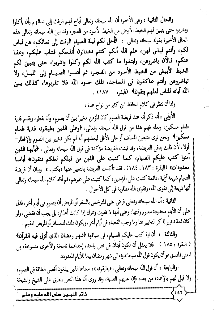 والحال الثانية: وهى الأخيرة أن الله سبحانه وتعالى أباح لهم الرفث إلى نسائهم وأن يأكلوا ويشربوا حتى يتبين لهم الخيط الأبيض من الخيط الأسود من الفجر، وقد بين الله سبحانه وتعالى هذه الحال الأخيرة بقوله سبحانه وتعالى: أُحِلَّ لَكُمْ لَيْلَةَ الصِّيامِ الرَّفَثُ إِلى نِسائِكُمْ، هُنَّ لِباسٌ لَكُمْ، وَأَنْتُمْ لِباسٌ لَهُنَّ، عَلِمَ اللَّهُ أَنَّكُمْ كُنْتُمْ تَخْتانُونَ أَنْفُسَكُمْ فَتابَ عَلَيْكُمْ، وَعَفا عَنْكُمْ، فَالْآنَ بَاشِرُوهُنَّ، وَابْتَغُوا ما كَتَبَ اللَّهُ لَكُمْ وَكُلُوا وَاشْرَبُوا، حَتَّى يَتَبَيَّنَ لَكُمُ الْخَيْطُ الْأَبْيَضُ مِنَ الْخَيْطِ الْأَسْوَدِ مِنَ الْفَجْرِ، ثُمَّ أَتِمُّوا الصِّيامَ إِلَى اللَّيْلِ، وَلا تُبَاشِرُوهُنَّ وَأَنْتُمْ عاكِفُونَ فِي الْمَساجِدِ، تِلْكَ حُدُودُ اللَّهِ فَلا تَقْرَبُوها، كَذلِكَ يُبَيِّنُ اللَّهُ آياتِهِ لِلنَّاسِ لَعَلَّهُمْ يَتَّقُونَ (البقرة- 187) .