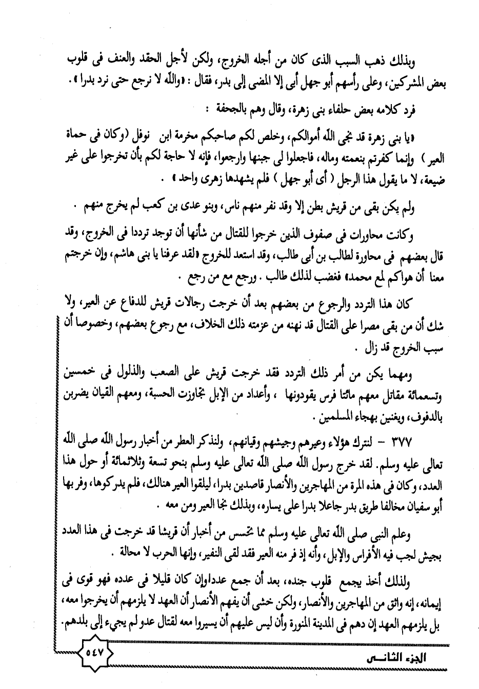 377- لنترك هؤلاء وعيرهم وجيشهم وقيانهم، ولنذكر العطر من أخبار رسول الله صلى الله تعالى عليه وسلم. لقد خرج رسول الله صلى الله تعالى عليه وسلم بنحو تسعة وثلاثمائة أو حول هذا العدد، وكان في هذه المرة من المهاجرين والأنصار قاصدين بدرا، ليلقوا العير هنالك، فلم يدركوها، وفربها أبو سفيان مخالفا طريق بدر جاعلا بدرا على يساره، وبذلك نجا العير ومن معه.