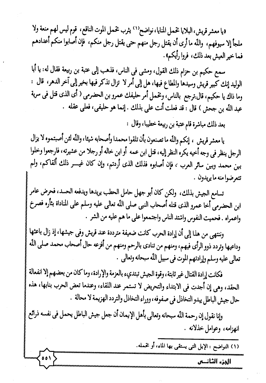 يا معشر قريش، إنكم والله ما تصنعون بأن تلقوا محمدا وأصحابه شيئا، والله لئن أصبتموه لا يزال الرجل ينظر في وجه أخيه يكره النظر إليه، قتل ابن عمه أو ابن خاله أو رجلا من عشيرته، فارجعوا وخلوا بين محمد وبين سائر العرب، فإن أصابوه فذلك الذى أردتم، وإن كان غير ذلك ألقاكم، ولم تتعرضوا منه ما يريدون.
