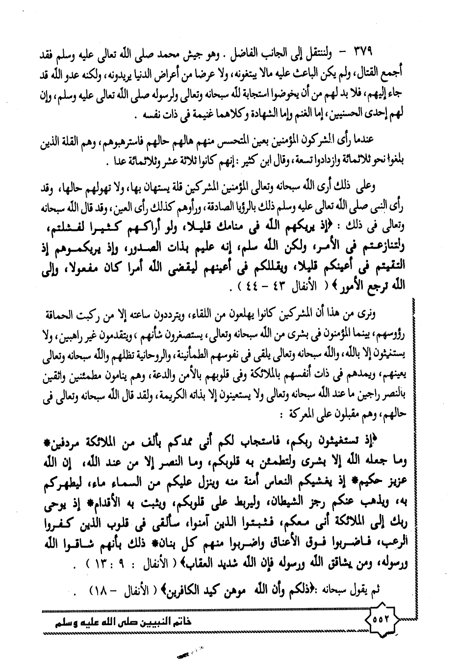 وَما جَعَلَهُ اللَّهُ إِلَّا بُشْرى وَلِتَطْمَئِنَّ بِهِ قُلُوبُكُمْ، وَمَا النَّصْرُ إِلَّا مِنْ عِنْدِ اللَّهِ، إِنَّ اللَّهَ عَزِيزٌ حَكِيمٌ. إِذْ يُغَشِّيكُمُ النُّعاسَ أَمَنَةً مِنْهُ وَيُنَزِّلُ عَلَيْكُمْ مِنَ السَّماءِ ماءً، لِيُطَهِّرَكُمْ بِهِ، وَيُذْهِبَ عَنْكُمْ رِجْزَ الشَّيْطانِ، وَلِيَرْبِطَ عَلى قُلُوبِكُمْ، وَيُثَبِّتَ بِهِ الْأَقْدامَ. إِذْ يُوحِي رَبُّكَ إِلَى الْمَلائِكَةِ أَنِّي مَعَكُمْ، فَثَبِّتُوا الَّذِينَ آمَنُوا، سَأُلْقِي فِي قُلُوبِ الَّذِينَ كَفَرُوا الرُّعْبَ، فَاضْرِبُوا فَوْقَ الْأَعْناقِ وَاضْرِبُوا مِنْهُمْ كُلَّ بَنانٍ. ذلِكَ بِأَنَّهُمْ شَاقُّوا اللَّهَ وَرَسُولَهُ، وَمَنْ يُشاقِقِ اللَّهَ وَرَسُولَهُ فَإِنَّ اللَّهَ شَدِيدُ الْعِقابِ (الأنفال: 9: 13) .