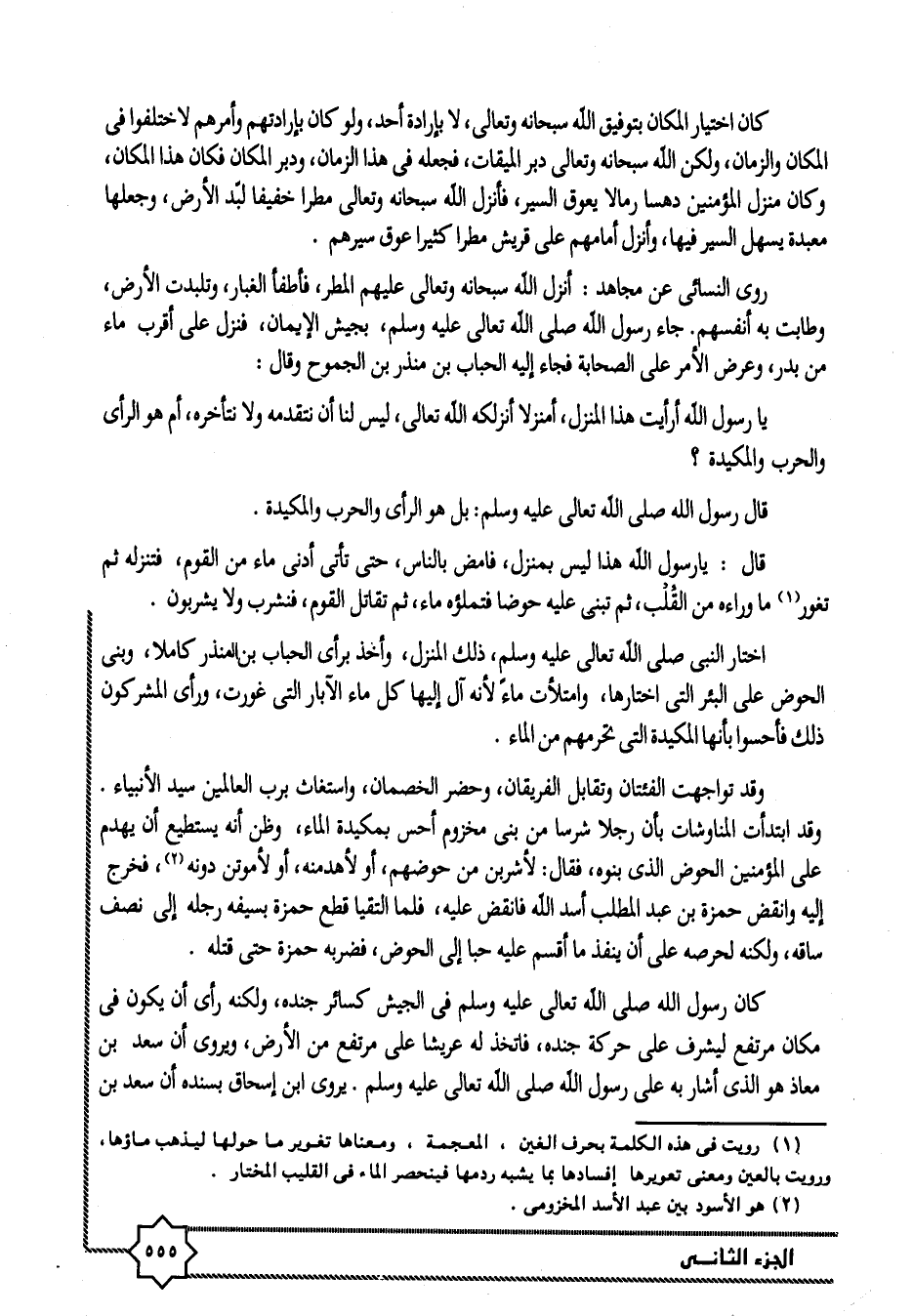 قال: يا رسول الله هذا ليس بمنزل، فامض بالناس، حتى تأتى أدنى ماء من القوم، فتنزله ثم تغور «1» ما وراءه من القلب، ثم تبنى عليه حوضا فتملؤه ماء، ثم تقاتل القوم، فنشرب ولا يشربون.