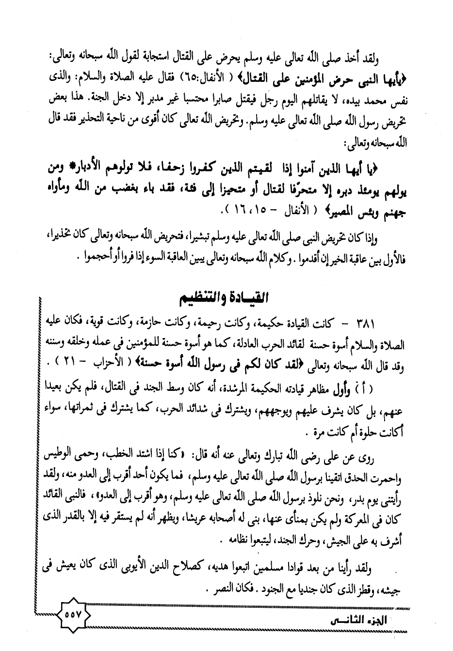 381- كانت القيادة حكيمة، وكانت رحيمة، وكانت حازمة، وكانت قوية، فكان عليه الصلاة والسلام أسوة حسنة لقائد الحرب العادلة، كما هو أسوة حسنة للمؤمنين في عمله وخلقه وسننه وقد قال الله سبحانه وتعالى لَقَدْ كانَ لَكُمْ فِي رَسُولِ اللَّهِ أُسْوَةٌ حَسَنَةٌ (الأحزاب- 21) .