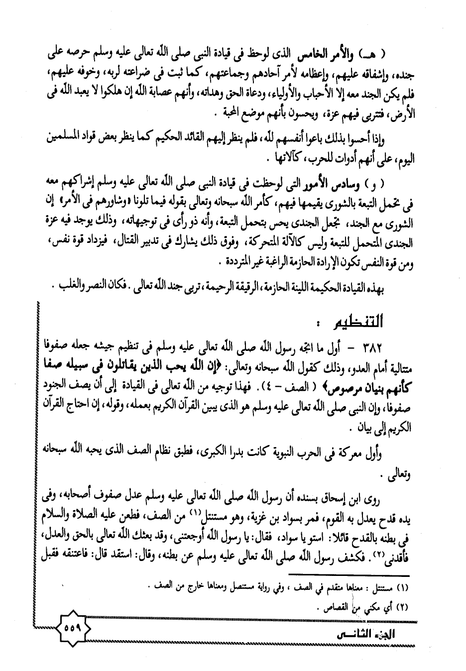 (الصف- 4) . فهذا توجيه من الله تعالى في القيادة إلى أن يصف الجنود صفوفا، وإن النبى صلى الله تعالى عليه وسلم هو الذى يبين القرآن الكريم بعمله، وقوله، إن احتاج القرآن الكريم إلى بيان.
