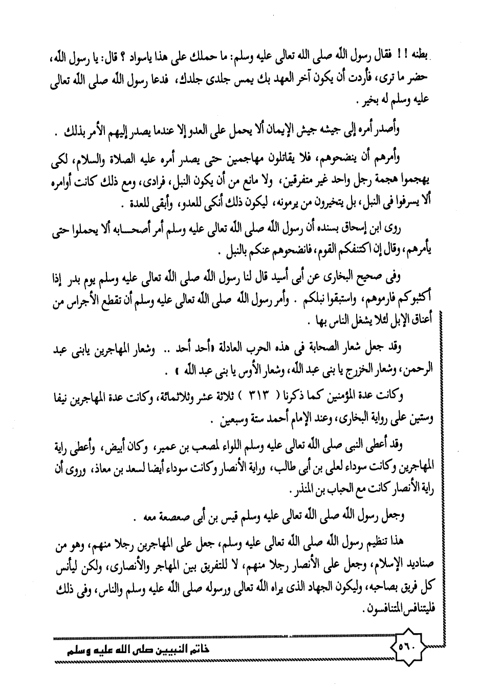 هذا تنظيم رسول الله صلى الله تعالى عليه وسلم، جعل على المهاجرين رجلا منهم، وهو من صناديد الإسلام، وجعل على الأنصار رجلا منهم، لا للتفريق بين المهاجر والأنصارى، ولكن ليأنس كل فريق بصاحبه، وليكون الجهاد الذى يراه الله تعالى ورسوله صلى الله عليه وسلم والناس، وفي ذلك فليتنافس المتنافسون.