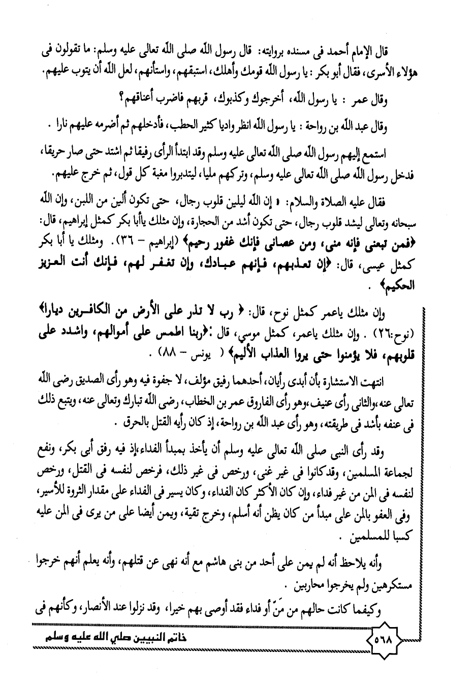 قال الإمام أحمد في مسنده بروايته: قال رسول الله صلى الله تعالى عليه وسلم: ما تقولون في هؤلاء الأسرى، فقال أبو بكر: يا رسول الله قومك وأهلك، استبقهم، واستأنهم، لعل الله أن يتوب عليهم.