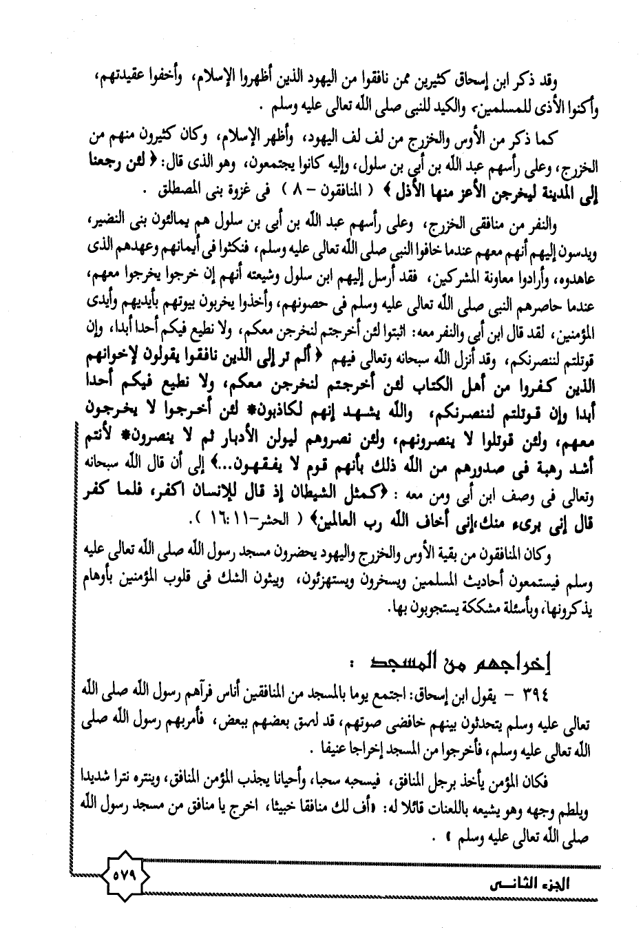 394- يقول ابن إسحاق: اجتمع يوما بالمسجد من المنافقين أناس فرآهم رسول الله صلى الله تعالى عليه وسلم يتحدثون بينهم خافضى صوتهم، قد لصق بعضهم ببعض، فأمر بهم رسول الله صلى الله تعالى عليه وسلم، فأخرجوا من المسجد إخراجا عنيفا.