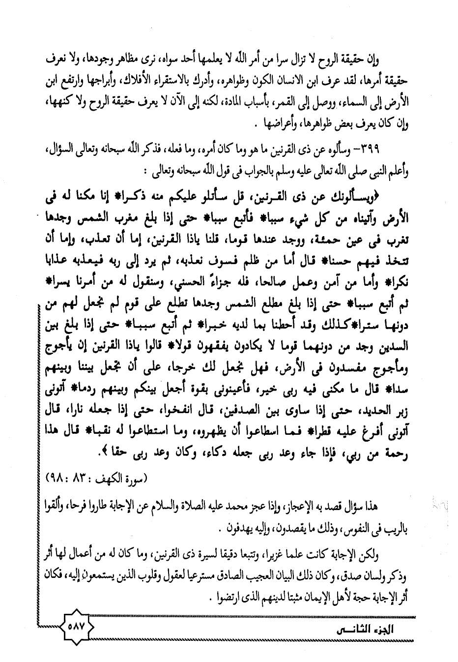 399- وسألوه عن ذى القرنين ما هو وما كان أمره، وما فعله، فذكر الله سبحانه وتعالى السؤال، وأعلم النبى صلى الله تعالى عليه وسلم بالجواب في قول الله سبحانه وتعالى: