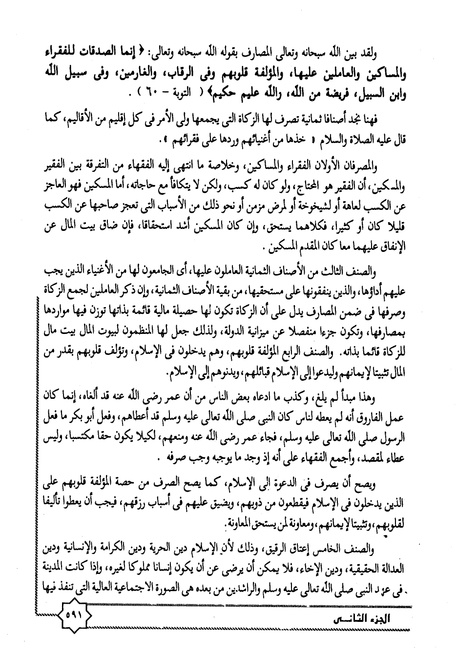 وهذا مبدأ لم يلغ، وكذب ما ادعاه بعض الناس من أن عمر رضى الله عنه قد ألغاه، وإنما كان عمل الفاروق أنه لم يعطه لناس كان النبى صلى الله تعالى عليه وسلم قد أعطاهم، وفعل أبو بكر ما فعل الرسول صلى الله تعالى عليه وسلم، فجاء عمر رضى الله عنه ومنعهم، لكيلا يكون حقا مكتسبا، وليس عطاء لمقصد، وأجمع الفقهاء على أنه إذ وجد ما يوجبه وجب صرفه.