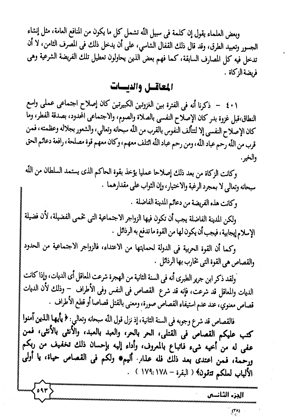ولقد ذكر ابن جرير الطبرى أنه في السنة الثانية من الهجرة شرعت المعاقل أى الديات، وإذا كانت الديات والمعاقل قد شرعت، فإنه قد شرع القصاص في النفس وفي الأطراف- وذلك لأن الديات قصاص معنوي، عند عدم استيفاء القصاص صورة، ومعنى بالقتل قصاصا أو قطع الأطراف.