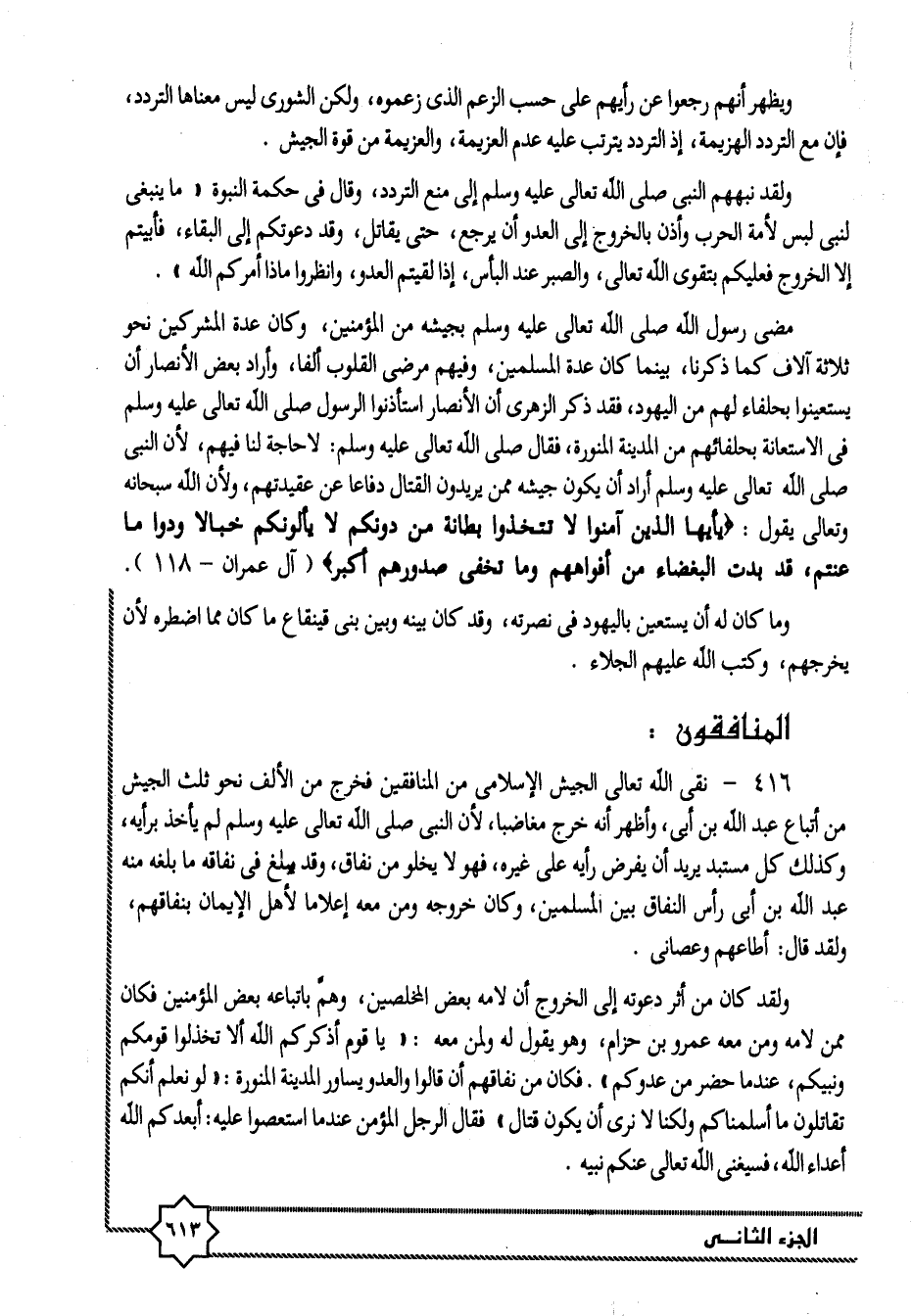 416- نقى الله تعالى الجيش الإسلامى من المنافقين فخرج من الألف نحو ثلث الجيش من أتباع عبد الله بن أبى، وأظهر أنه خرج مغاضبا، لأن النبى صلى الله تعالى عليه وسلم لم يأخذ برأيه، وكذلك كل مستبد يريد أن يفرض رأيه على غيره، فهو لا يخلو من نفاق، وقد يبلغ في نفاقه ما بلغه منه عبد الله بن أبى رأس النفاق بين المسلمين، وكان خروجه ومن معه إعلاما لأهل الإيمان بنفاقهم، ولقد قال: أطاعهم وعصانى.