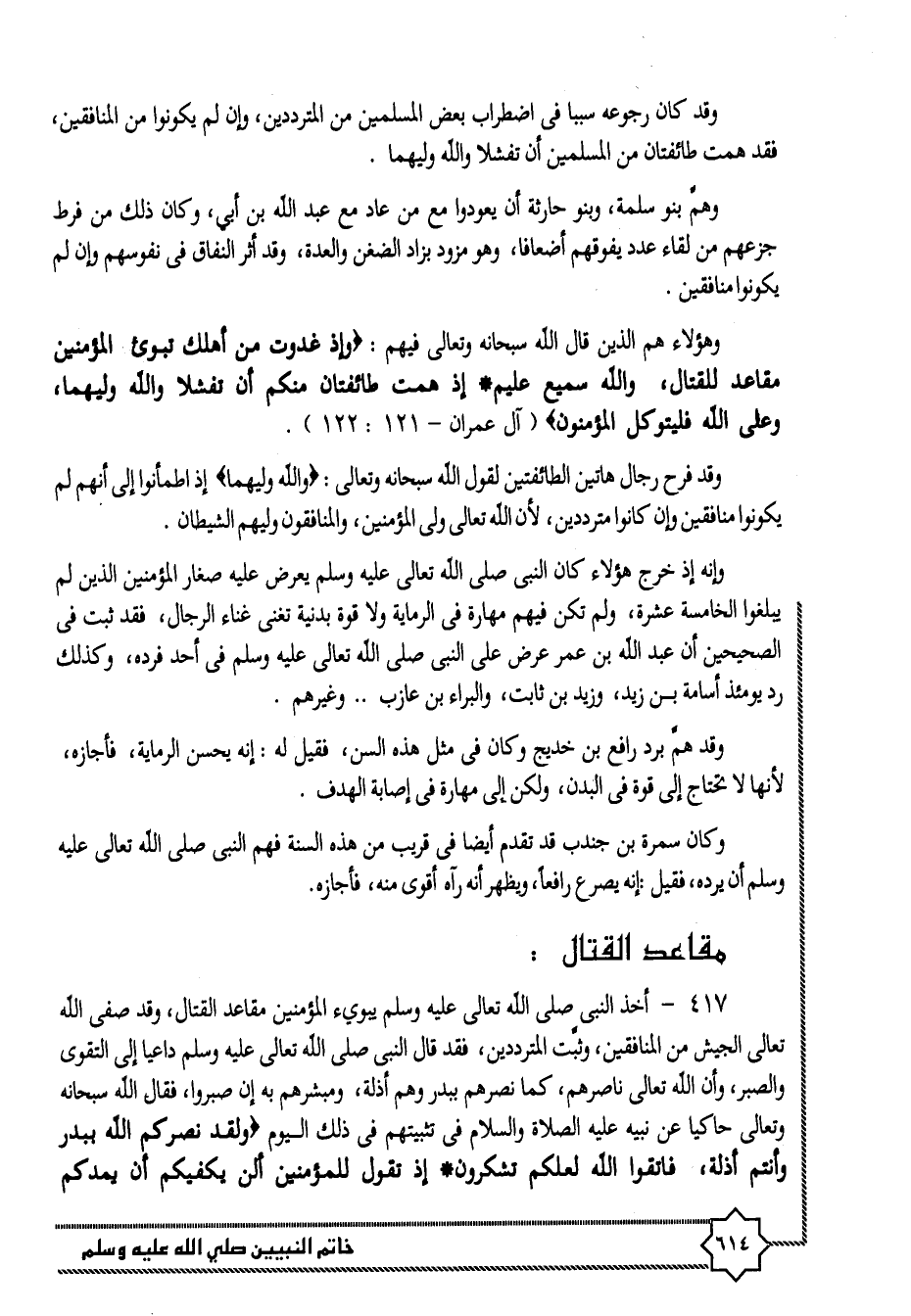 417- أخذ النبى صلى الله تعالى عليه وسلم يبويء المؤمنين مقاعد القتال، وقد صفى الله تعالى الجيش من المنافقين، وثبّت المترددين، فقد قال النبى صلى الله تعالى عليه وسلم داعيا إلى التقوى والصبر، وأن الله تعالى ناصرهم، كما نصرهم ببدر وهم أذلة، ومبشرهم به إن صبروا، فقال الله سبحانه وتعالى حاكيا عن نبيه عليه الصلاة والسلام في تثبيتهم في ذلك اليوم وَلَقَدْ نَصَرَكُمُ اللَّهُ بِبَدْرٍ وَأَنْتُمْ أَذِلَّةٌ، فَاتَّقُوا اللَّهَ لَعَلَّكُمْ تَشْكُرُونَ. إِذْ تَقُولُ لِلْمُؤْمِنِينَ أَلَنْ يَكْفِيَكُمْ أَنْ يُمِدَّكُمْ