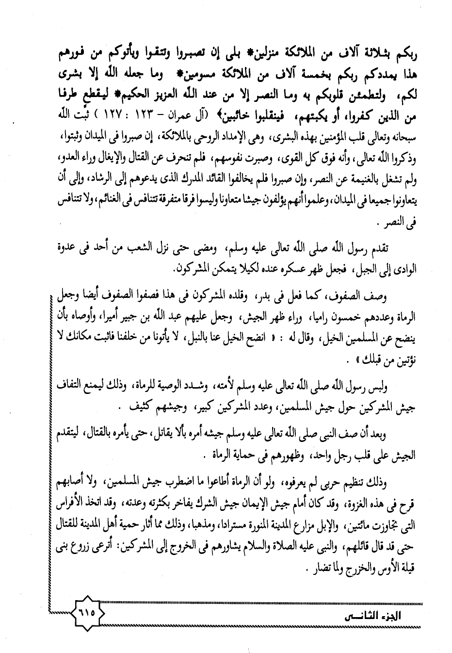 رَبُّكُمْ بِثَلاثَةِ آلافٍ مِنَ الْمَلائِكَةِ مُنْزَلِينَ. بَلى إِنْ تَصْبِرُوا وَتَتَّقُوا وَيَأْتُوكُمْ مِنْ فَوْرِهِمْ هذا يُمْدِدْكُمْ رَبُّكُمْ بِخَمْسَةِ آلافٍ مِنَ الْمَلائِكَةِ مُسَوِّمِينَ. وَما جَعَلَهُ اللَّهُ إِلَّا بُشْرى لَكُمْ، وَلِتَطْمَئِنَّ قُلُوبُكُمْ بِهِ وَمَا النَّصْرُ إِلَّا مِنْ عِنْدِ اللَّهِ الْعَزِيزِ الْحَكِيمِ. لِيَقْطَعَ طَرَفاً مِنَ الَّذِينَ كَفَرُوا، أَوْ يَكْبِتَهُمْ، فَيَنْقَلِبُوا خائِبِينَ (آل عمران- 123: 127) ثبت الله سبحانه وتعالى قلب المؤمنين بهذه البشرى، وهى الإمداد الروحى بالملائكة، إن صبروا في الميدان وثبتوا، وذكروا الله تعالى، وأنه فوق كل القوى، وصبرت نفوسهم، فلم تنحرف عن القتال والإيغال وراء العدو، ولم تشغل بالغنيمة عن النصر، وإن صبروا فلم يخالفوا القائد المدرك الذى يدعوهم إلى الرشاد، وإلى أن يتعاونوا جميعا في الميدان، وعلموا أنهم يؤلفون جيشا متعاونا وليسوا فرقا متفرقة تتنافس في الغنائم، ولا تتنافس فى النصر.