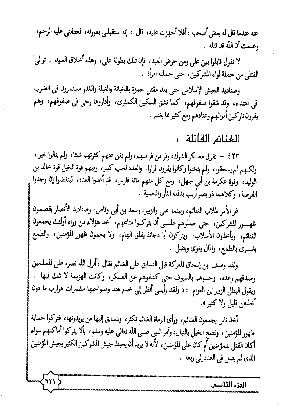 423- تفرق معسكر الشرك، وفر من فر منهم، ولم تغن عنهم كثرتهم شيئا، ولم ينالوا خيرا، ولكنهم لم يسحقوا، ولم يثخنوا وكانوا يفرون فرارا، والعدد لجب كبير، وفيهم قوة الخيل قوة خالد بن الوليد، وقوة عكرمة بن أبى جهل، ومع كل منهم مائة فارس، قد أعدوا العدة، لينقضوا إن وجدوا الفرصة، وكلاهما ذو بصر أريب يدفعه الثأر والحمية.