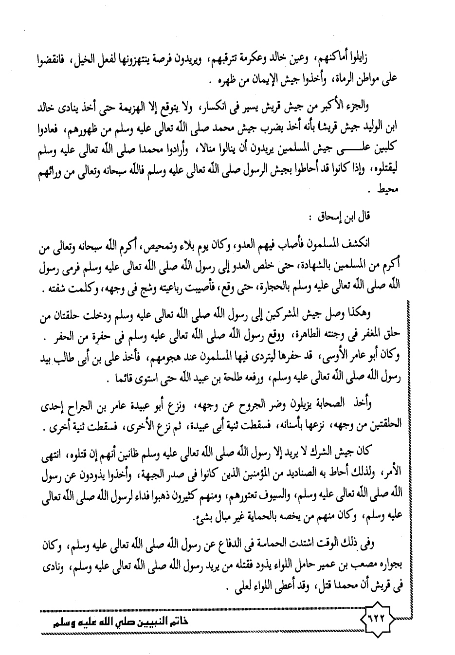 انكشف المسلمون فأصاب فيهم العدو، وكان يوم بلاء وتمحيص، أكرم الله سبحانه وتعالى من أكرم من المسلمين بالشهادة، حتى خلص العدو إلى رسول الله صلى الله تعالى عليه وسلم فرمى رسول الله صلى الله تعالى عليه وسلم بالحجارة، حتى وقع، فأصيبت رباعيته وشج في وجهه، وكلمات شفته.