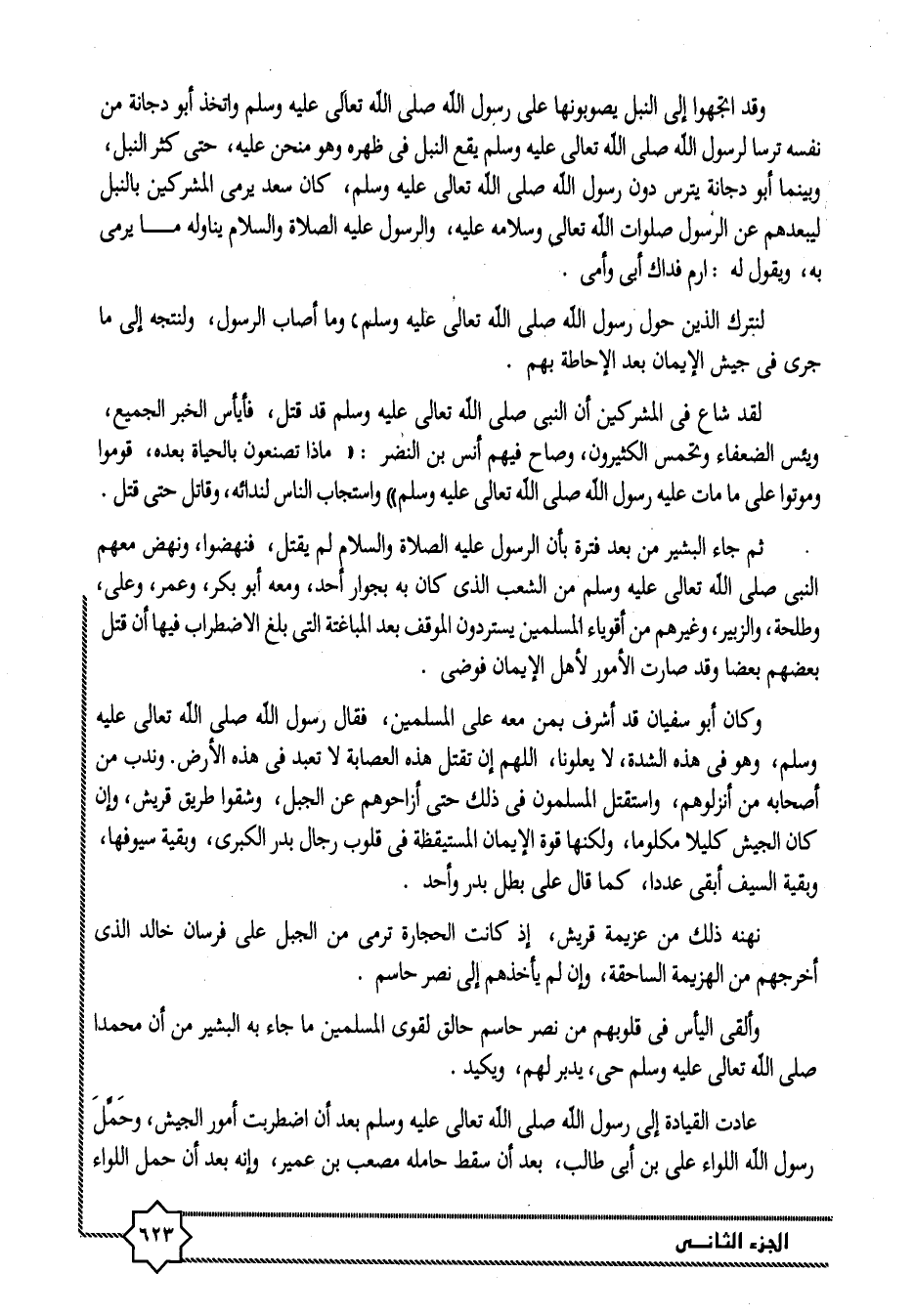 ثم جاء البشير من بعد فترة بأن الرسول عليه الصلاة والسلام لم يقتل، فنهضوا، ونهض معهم النبى صلى الله تعالى عليه وسلم من الشعب الذى كان به بجوار أحد، ومعه أبو بكر، وعمر، وعلى، وطلحة، والزبير، وغيرهم من أقوياء المسلمين يستردون الموقف بعد المباغتة التى بلغ الاضطراب فيها أن قتل بعضهم بعضا وقد صارت الأمور لأهل الإيمان فوضى.
