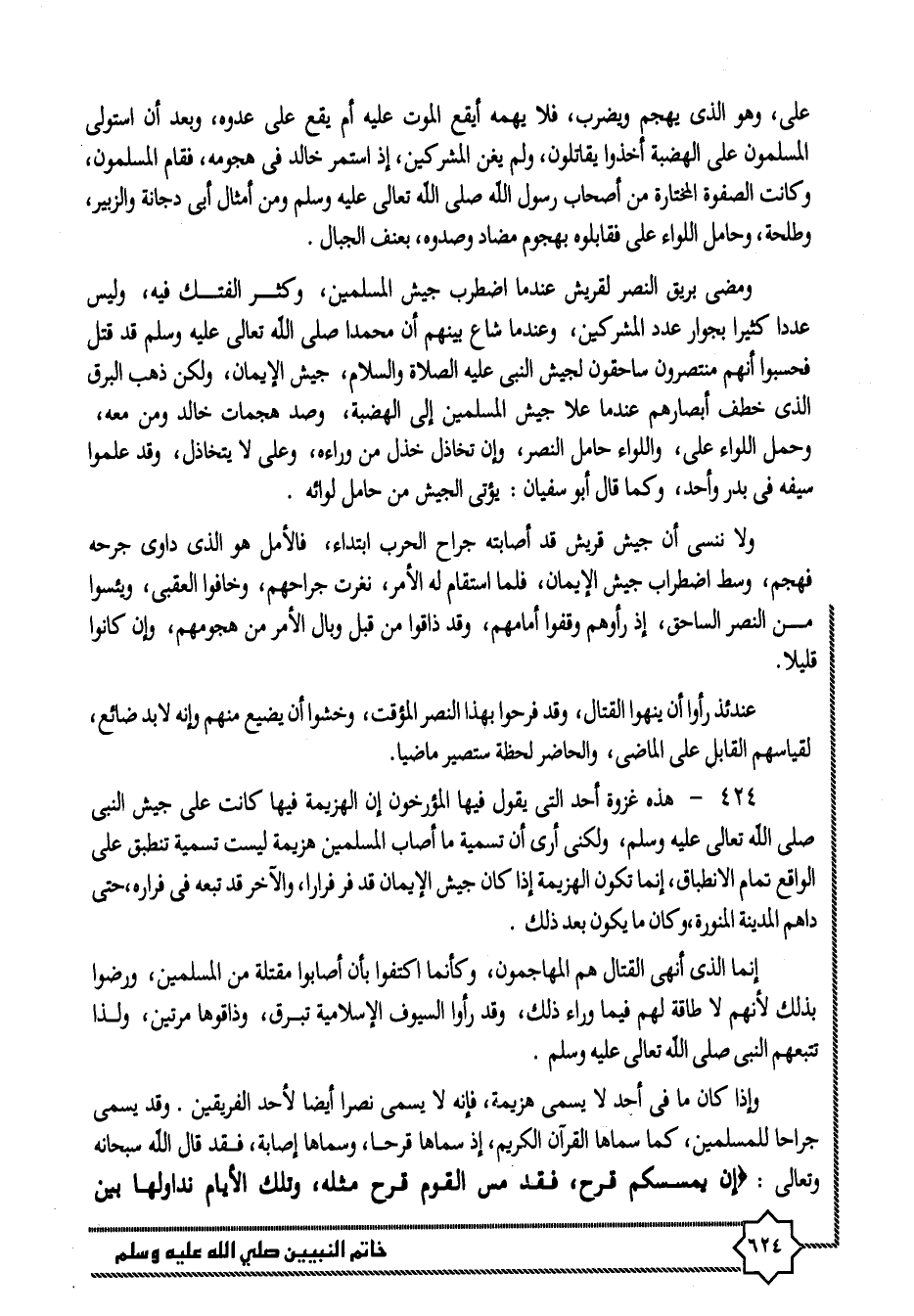 424- هذه غزوة أحد التى يقول فيها المؤرخون إن الهزيمة فيها كانت على جيش النبى صلى الله تعالى عليه وسلم، ولكنى أرى أن تسمية ما أصاب المسلمين هزيمة ليست تسمية تنطبق على الواقع تمام الانطباق، إنما تكون الهزيمة إذا كان جيش الإيمان قد فر فرارا، والآخر قد تبعه في فراره، حتى داهم المدينة المنورة، وكان ما يكون بعد ذلك.
