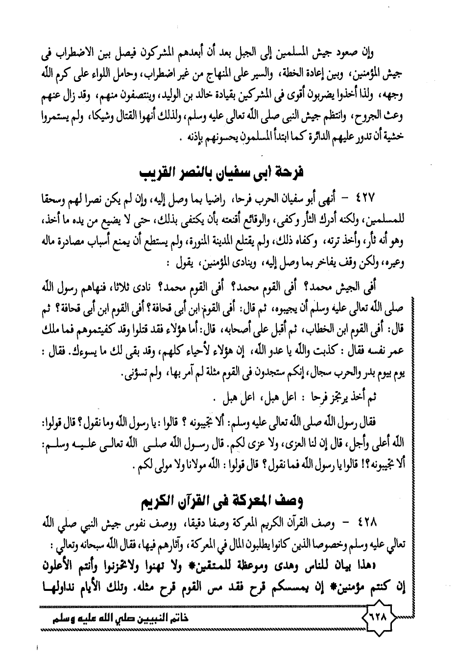 427- أنهى أبو سفيان الحرب فرحا، راضيا بما وصل إليه، وإن لم يكن نصرا لهم وسحقا للمسلمين، ولكنه أدرك الثأر وكفى، والوقائع أقنعته بأن يكتفى بذلك، حتى لا يضيع من يده ما أخذ، وهو أنه ثأر، وأخذ ترته، وكفاه ذلك، ولم يقتلع المدينة المنورة، ولم يستطع أن يمنع أسباب مصادرة ماله وعيره، ولكن وقف يفاخر بما وصل إليه، وينادى المؤمنين، يقول: