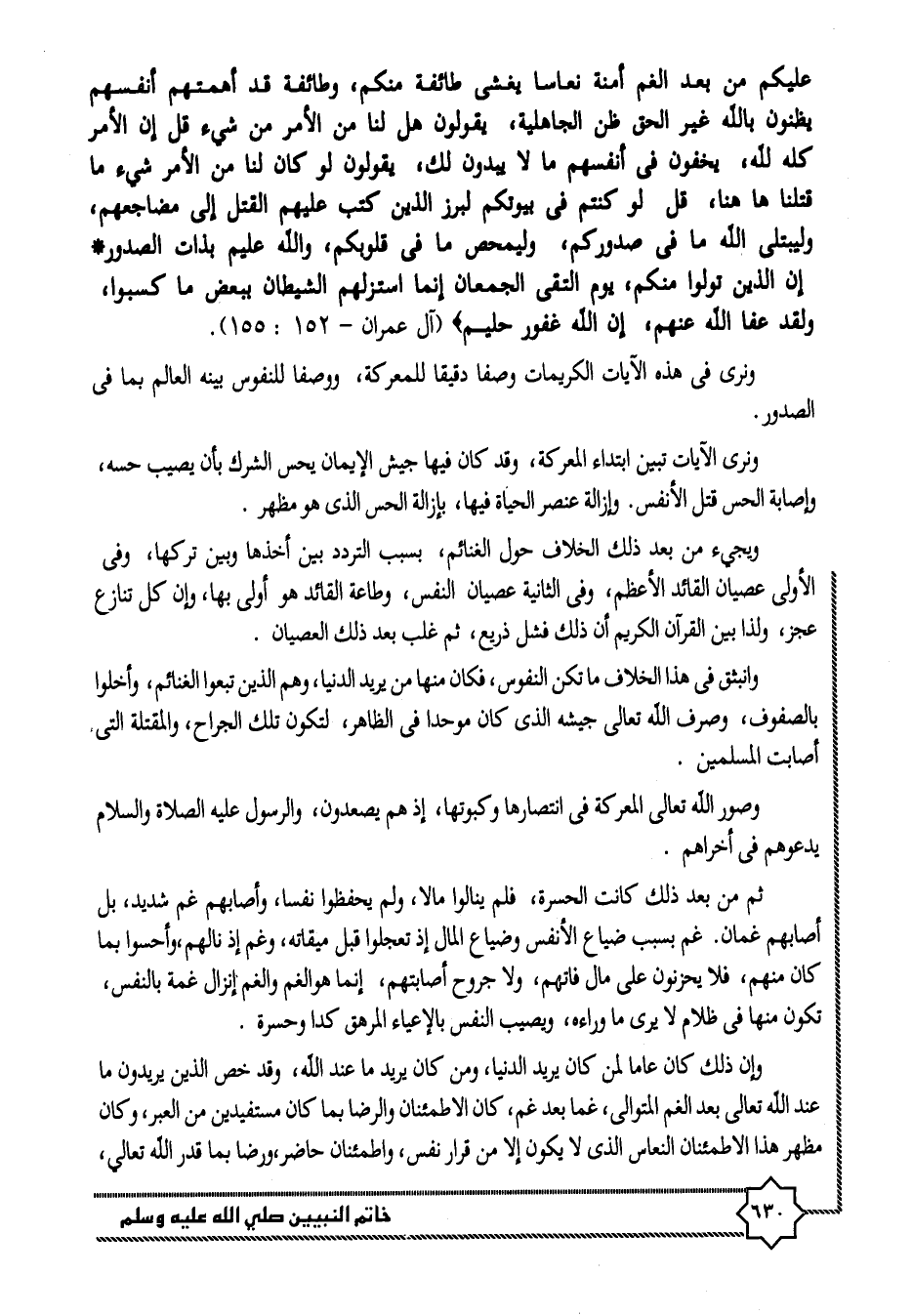 عَلَيْكُمْ مِنْ بَعْدِ الْغَمِّ أَمَنَةً نُعاساً يَغْشى طائِفَةً مِنْكُمْ، وَطائِفَةٌ قَدْ أَهَمَّتْهُمْ أَنْفُسُهُمْ يَظُنُّونَ بِاللَّهِ غَيْرَ الْحَقِّ ظَنَّ الْجاهِلِيَّةِ، يَقُولُونَ هَلْ لَنا مِنَ الْأَمْرِ مِنْ شَيْءٍ قُلْ إِنَّ الْأَمْرَ كُلَّهُ لِلَّهِ، يُخْفُونَ فِي أَنْفُسِهِمْ ما لا يُبْدُونَ لَكَ، يَقُولُونَ لَوْ كانَ لَنا مِنَ الْأَمْرِ شَيْءٌ ما قُتِلْنا هاهُنا، قُلْ لَوْ كُنْتُمْ فِي بُيُوتِكُمْ لَبَرَزَ الَّذِينَ كُتِبَ عَلَيْهِمُ الْقَتْلُ إِلى مَضاجِعِهِمْ، وَلِيَبْتَلِيَ اللَّهُ ما فِي صُدُورِكُمْ، وَلِيُمَحِّصَ ما فِي قُلُوبِكُمْ، وَاللَّهُ عَلِيمٌ بِذاتِ الصُّدُورِ.