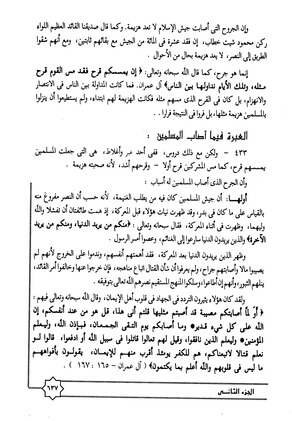 433- ولكن مع ذلك دروس، ففى أحد عبر وأغلاط، هى التى جعلت المسلمين يمسسهم قرح، كما مس المشركين قرح أولا- وقرحهم أشد، لأنه صحبته هزيمة.