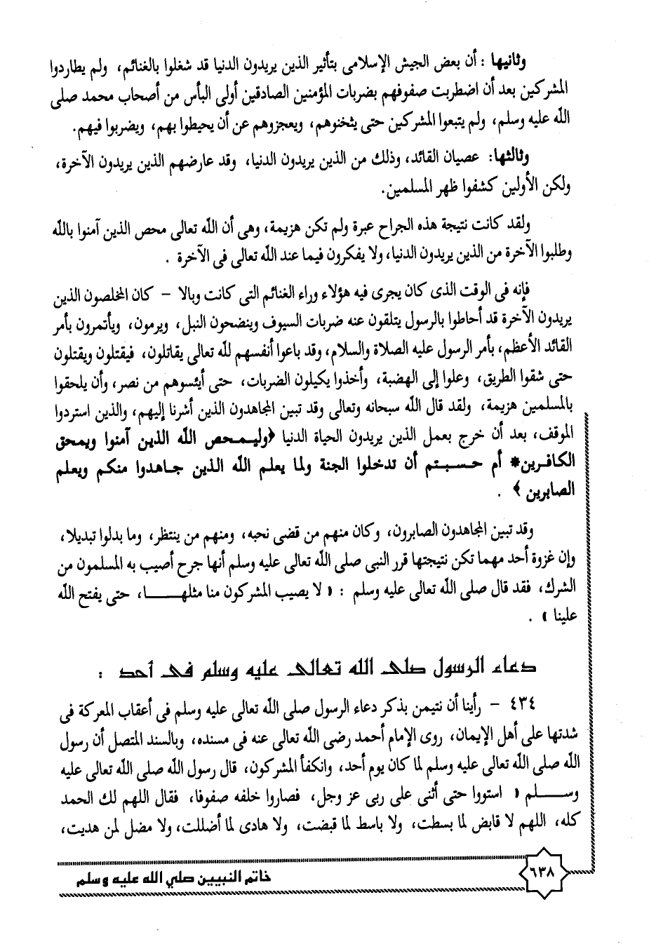 434- رأينا أن نتيمن بذكر دعاء الرسول صلى الله تعالى عليه وسلم في أعقاب المعركة في شدتها على أهل الإيمان، روى الإمام أحمد رضى الله تعالى عنه في مسنده، وبالسند المتصل أن رسول الله صلى الله تعالى عليه وسلم لما كان يوم أحد، وانكفأ المشركون، قال رسول الله صلى الله تعالى عليه وسلم «استووا حتى أثنى على ربى عز وجل، فصاروا خلفه صفوفا، فقال اللهم لك الحمد كله، اللهم لا قابض لما بسطت، ولا باسط لما قبضت، ولا هادى لما أضللت، ولا مضل لمن هديت،