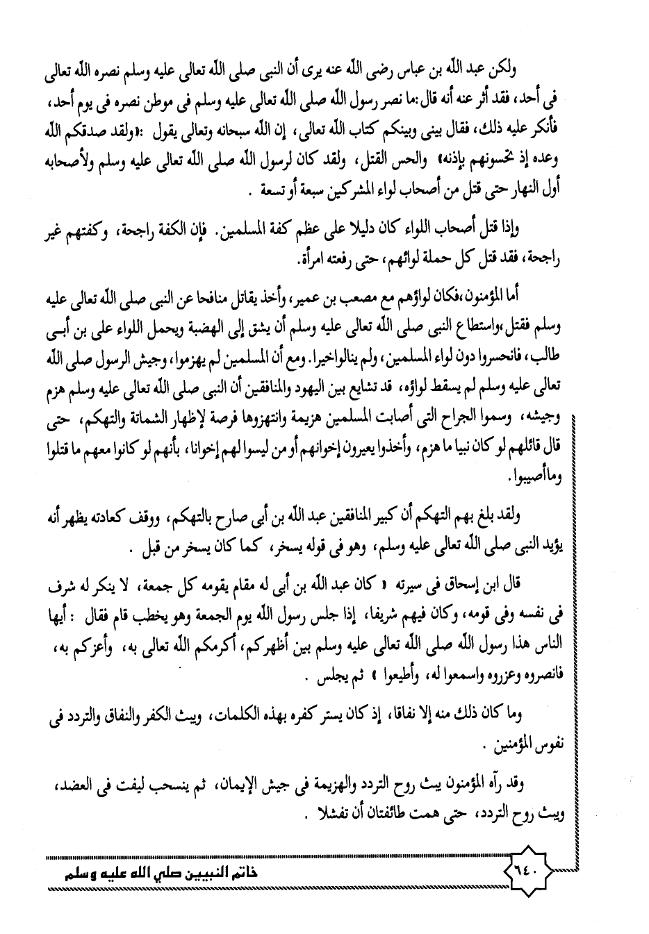 أما المؤمنون، فكان لواؤهم مع مصعب بن عمير، وأخذ يقاتل منافحا عن النبى صلى الله تعالى عليه وسلم فقتل، واستطاع النبى صلى الله تعالى عليه وسلم أن يشق إلى الهضبة ويحمل اللواء على بن أبى طالب، فانحسروا دون لواء المسلمين، ولم ينالوا خيرا. ومع أن المسلمين لم يهزموا، وجيش الرسول صلى الله تعالى عليه وسلم لم يسقط لواؤه، قد تشايع بين اليهود والمنافقين أن النبى صلى الله تعالى عليه وسلم هزم وجيشه، وسموا الجراح التى أصابت المسلمين هزيمة وانتهزوها فرصة لإظهار الشماتة والتهكم، حتى قال قائلهم لو كان نبيا ما هزم، وأخذوا يعيرون إخوانهم أو من ليسوا لهم إخوانا، بأنهم لو كانوا معهم ما قتلوا وما أصيبوا.