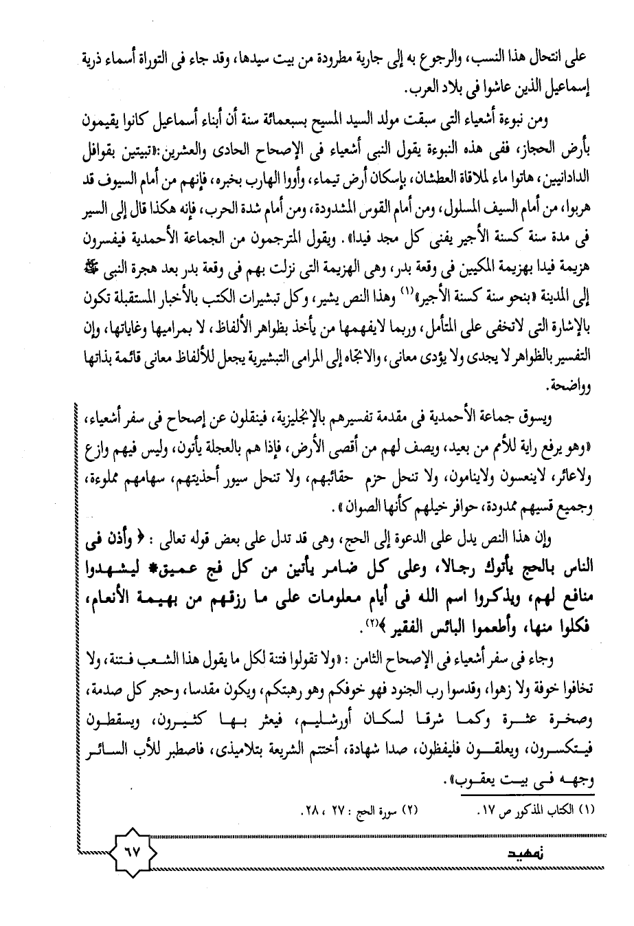 ومن نبوءة أشعياء التى سبقت مولد السيد المسيح بسبعمائة سنة أن أبناء أسماعيل كانوا يقيمون بأرض الحجاز، ففى هذه النبوءة يقول النبى أشعياء فى الإصحاح الحادى والعشرين: «تبيتين بقوافل الدادانيين، هاتوا ماء لملاقاة العطشان، بإسكان أرض تيماء، وأووا الهارب بخبره، فإنهم من أمام السيوف قد هربوا، من أمام السيف المسلول، ومن أمام القوس المشدودة، ومن أمام شدة الحرب، فإنه هكذا قال إلى السير فى مدة سنة كسنة الأجير يفنى كل مجد فيدا» . ويقول المترجمون من الجماعة الأحمدية فيفسرون هزيمة فيدا بهزيمة المكيين فى وقعة بدر، وهى الهزيمة التى نزلت بهم فى وقعة بدر بعد هجرة النبى صلّى الله عليه وسلّم إلى المدينة «بنحو سنة كسنة الأجير» «1» وهذا النص يشير، وكل تبشيرات الكتب بالأخبار المستقبلة تكون بالإشارة التى لا تخفى على المتأمل، وربما لا يفهمها من يأخذ بظواهر الألفاظ، لا بمراميها وغاياتها، وإن التفسير بالظواهر لا يجدى ولا يؤدى معانى، والاتجاه إلى المرامى التبشيرية يجعل للألفاظ معانى قائمة بذاتها وواضحة.