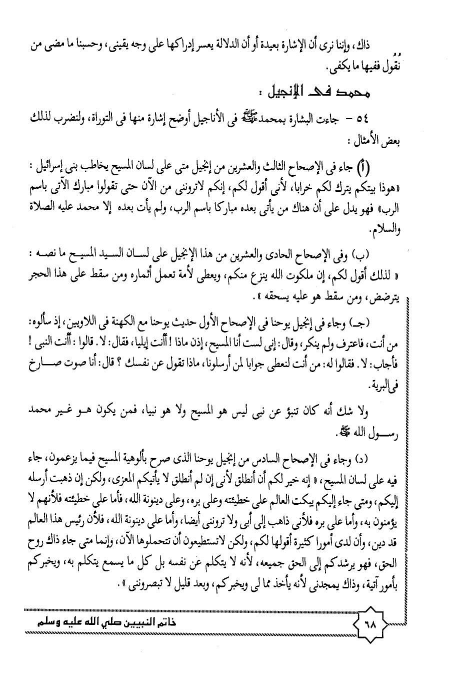 54- جاءت البشارة بمحمد صلّى الله عليه وسلّم فى الأناجيل أوضح إشارة منها فى التوراة، ولنضرب لذلك بعض الأمثال: