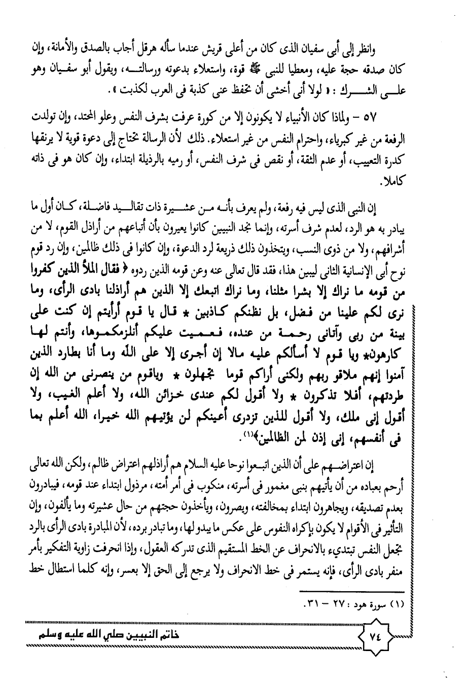 57- ولماذا كان الأنبياء لا يكونون إلا من كورة عرفت بشرف النفس وعلو المحتد، وإن تولدت الرفعة من غير كبرياء، واحترام النفس من غير استعلاء. ذلك لأن الرسالة تحتاج إلى دعوة قوية لا يرنقها كدرة التعييب، أو عدم الثقة، أو نقص فى شرف النفس، أو رميه بالرذيلة ابتداء، وإن كان هو فى ذاته كاملا.