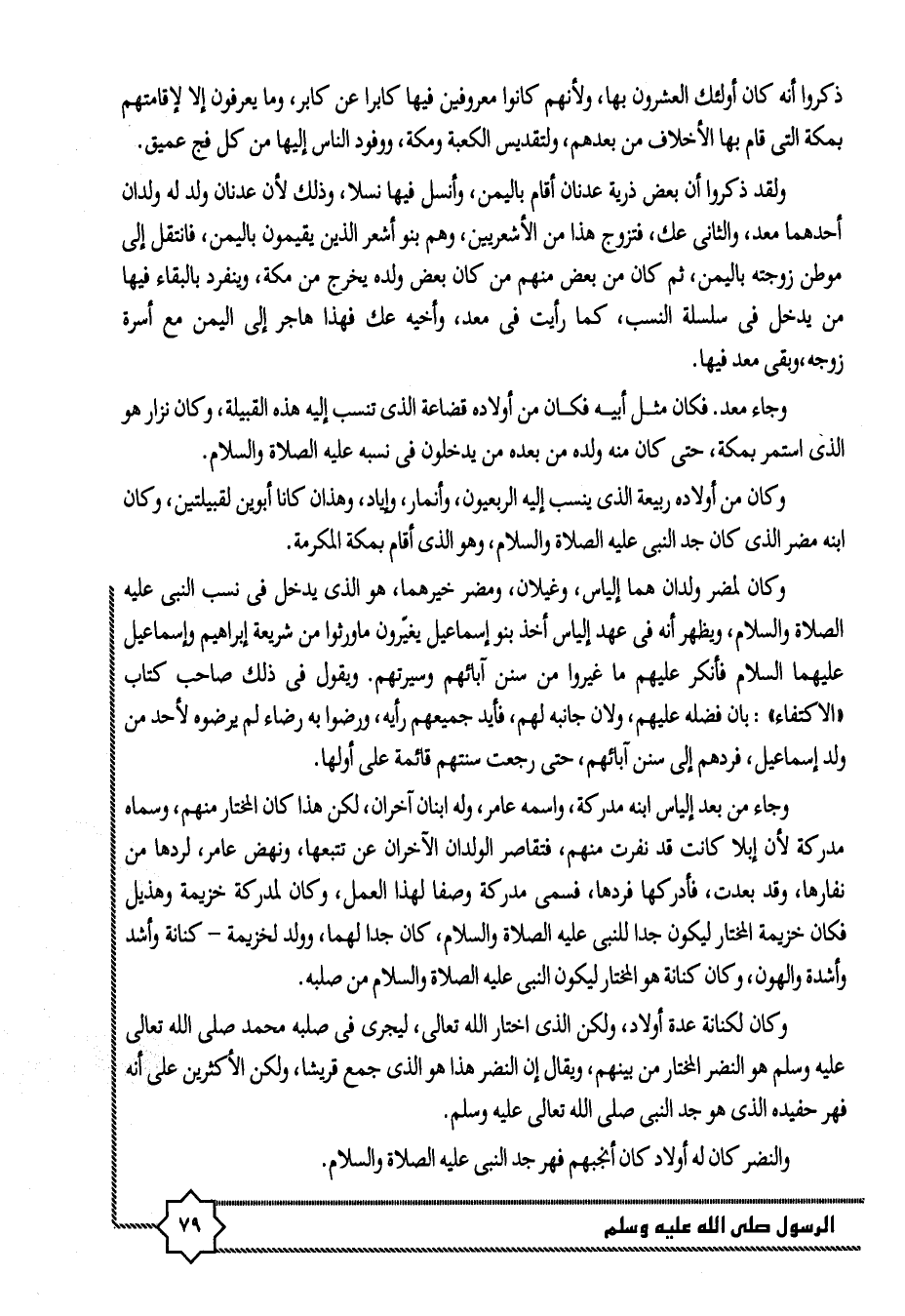 وكان لكنانة عدة أولاد، ولكن الذى اختار الله تعالى، ليجرى فى صلبه محمد صلى الله تعالى عليه وسلم هو النضر المختار من بينهم، ويقال إن النضر هذا هو الذى جمع قريشا، ولكن الأكثرين على أنه فهر حفيده الذى هو جد النبى صلى الله تعالى عليه وسلم.
