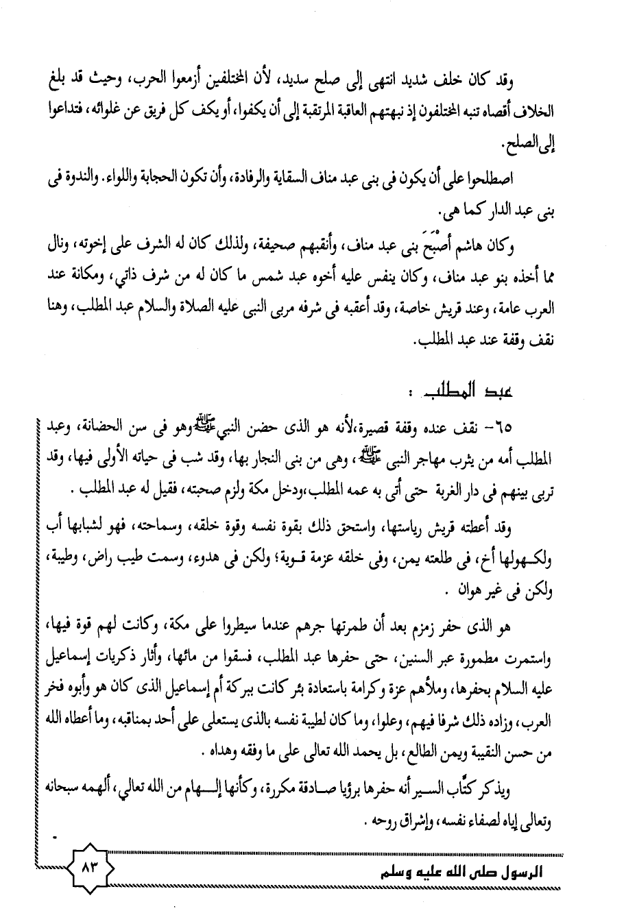 65- نقف عنده وقفة قصيرة، لأنه هو الذى حضن النبي صلّى الله عليه وسلّم وهو فى سن الحضانة، وعبد المطلب أمه من يثرب مهاجر النبى صلّى الله عليه وسلّم، وهى من بنى النجار بها، وقد شب فى حياته الأولى فيها، وقد تربى بينهم فى دار الغربة حتى أتى به عمه المطلب، ودخل مكة ولزم صحبته، فقيل له عبد المطلب.