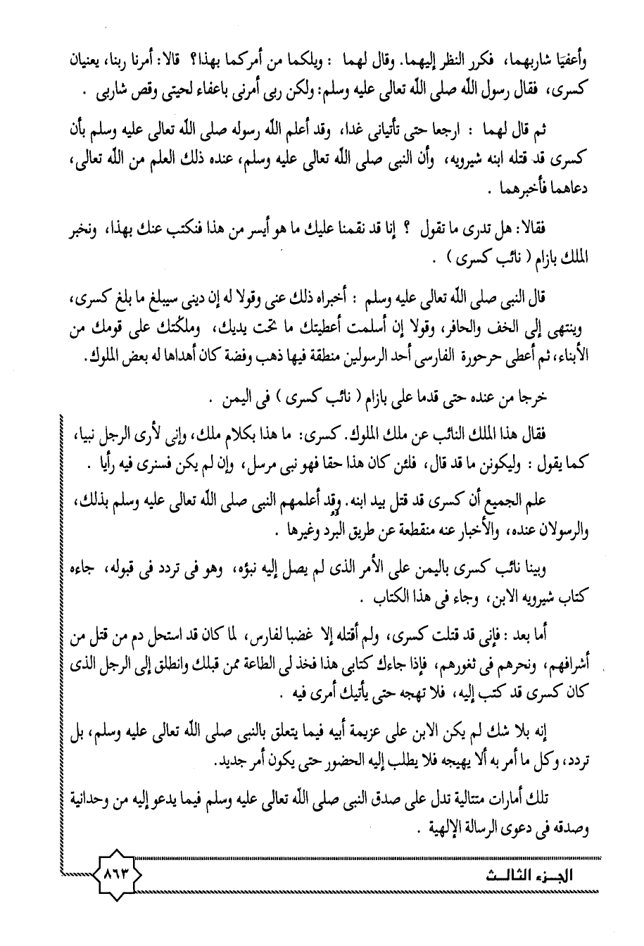 علم الجميع أن كسرى قد قتل بيد ابنه. وقد أعلمهم النبى صلى الله تعالى عليه وسلم بذلك، والرسولان عنده، والأخبار عنه منقطعة عن طريق البرد وغيرها.