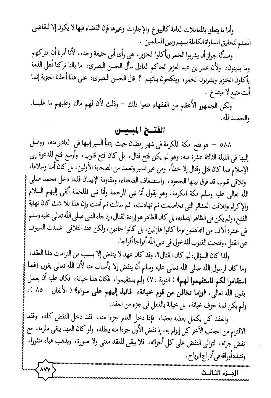 ولذا كان السؤال: لم كان القتال؟، وقد كان عهد لا ينقض إلا بسبب من التزامات هذا العقد، وما كان لرسول الله صلى الله تعالى عليه وسلم أن ينقض إلا بأسباب منه لأن الله تعالى يقول فَمَا اسْتَقامُوا لَكُمْ فَاسْتَقِيمُوا لَهُمْ (التوبة: 7) ولم يستقيموا، فكان هذا خيانة، فكان عليه أن يعمل بقول الله تعالى، وَإِمَّا تَخافَنَّ مِنْ قَوْمٍ خِيانَةً، فَانْبِذْ إِلَيْهِمْ عَلى سَواءٍ (الأنفال- 85) ، ولم يكن ثمة خوف خيانة، بل خيانة بالفعل فى جزء من العقد.