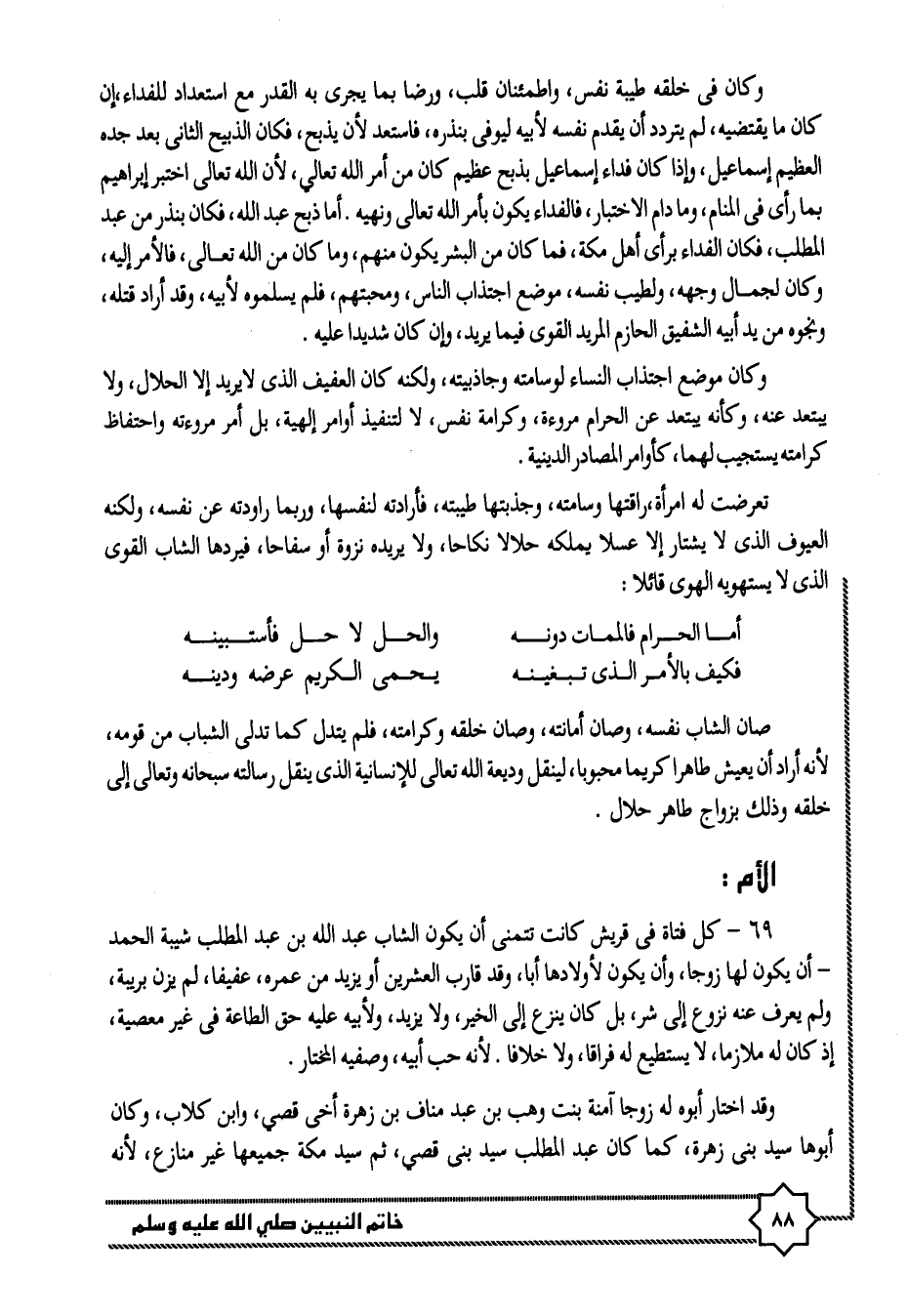 69- كل فتاة فى قريش كانت تتمنى أن يكون الشاب عبد الله بن عبد المطلب شيبة الحمد أن يكون لها زوجا، وأن يكون لأولادها أبا، وقد قارب العشرين أو يزيد من عمره، عفيفا، لم يزن بريبة، ولم يعرف عنه نزوع إلى شر، بل كان ينزع إلى الخير، ولا يزيد، ولأبيه عليه حق الطاعة فى غير معصية، إذ كان له ملازما، لا يستطيع له فراقا، ولا خلافا. لأنه حب أبيه، وصفيه المختار.