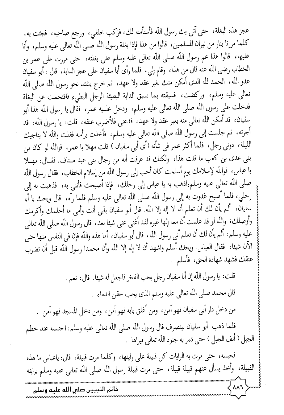 عجز هذه البغلة، حتى آتى بك رسول الله فأستأمنه لك، فركب خلفي، ورجع صاحبه، فجئت به، كلما مررنا بنار من نيران المسلمين، قالوا من هذا فإذا بغلة رسول الله صلى الله تعالى عليه وسلم، وأنا عليها، قالوا هذا عم رسول الله صلى الله تعالى عليه وسلم على بغلته، حتى مررت على عمر بن الخطاب رضى الله عنه قال من هذا، وقام إلي، فلما رأى أبا سفيان على عجز الدابة، قال: أبو سفيان عدو الله، الحمد لله الذى أمكن منك بغير عقد ولا عهد، ثم خرج يشتد نحو رسول الله صلى الله تعالى عليه وسلم، وركضت، فسبقته بما تسبق الدابة البطيئة الرجل البطيء فاقتحمت عن البغلة فدخلت على رسول الله صلى الله تعالى عليه وسلم، ودخل عليه عمر، فقال يا رسول الله هذا أبو سفيان، قد أمكن الله تعالى منه بغير عقد ولا عهد، فدعنى فلأضرب عنقه، قلت: يا رسول الله، قد أجرته، ثم جلست إلى رسول الله صلى الله تعالى عليه وسلم، فأخذت برأسه فقلت والله لا يناجيك الليلة، دونى رجل، فلما أكثر عمر فى شأنه (أى أبى سفيان) قلت مهلا يا عمر، فوالله لو كان من بنى عدى بن كعب ما قلت هذا، ولكنك قد عرفت أنه من رجال بنى عبد مناف. فقال: مهلا يا عباس، فو الله لإسلامك يوم أسلمت كان أحب إلى رسول الله من إسلام الخطاب، فقال رسول الله صلى الله تعالى عليه وسلم: اذهب به يا عباس إلى رحلك، فإذا أصبحت فأتنى به، فذهبت به إلى رحلي، فلما أصبح غدوت به إلى رسول الله صلى الله تعالى عليه وسلم فلما رآه، قال ويحك يا أبا سفيان، ألم يأن لك أن تعلم أنه لا إله إلا الله. قال أبو سفيان بأبى أنت وأمى ما أحلمك وأكرمك وأوصلك؛ والله لو قد علمت أن معه إلها غيره لقد أغنى عنى شيئا بعد، قال رسول الله صلى الله تعالى عليه وسلم: ألم يأن لك أن تعلم أنى رسول الله، قال أبو سفيان، أما هذه والله فإن فى النفس منها حتى الآن شيئا، فقال العباس: ويحك أسلم واشهد أن لا إله إلا الله وأن محمدا رسول الله قبل أن تضرب عنقك فشهد شهادة الحق، فأسلم.