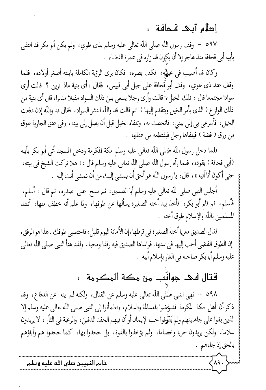 598- نهى النبى صلى الله تعالى عليه وسلم عن القتال، ولكنه لم ينه عن الدفاع، وقد ذكر أن أهل مكة المكرمة قد رضوا بالمسالمة والسلام، واطمأنوا إلى النبى صلى الله تعالى عليه وسلم إلا الذين بقوا على جاهليتهم ولم يذوقوا حب الإيمان أو أن فيهم الحقد الدفين، والرغبة فى الثأر، لا يريدون سلاما، ولكن يريدون حربا وخصاما، ولم يؤخذوا بالقوة، بل جحدوا بها، كما جحدوا هم وآباؤهم بالحق إذ جاءهم.