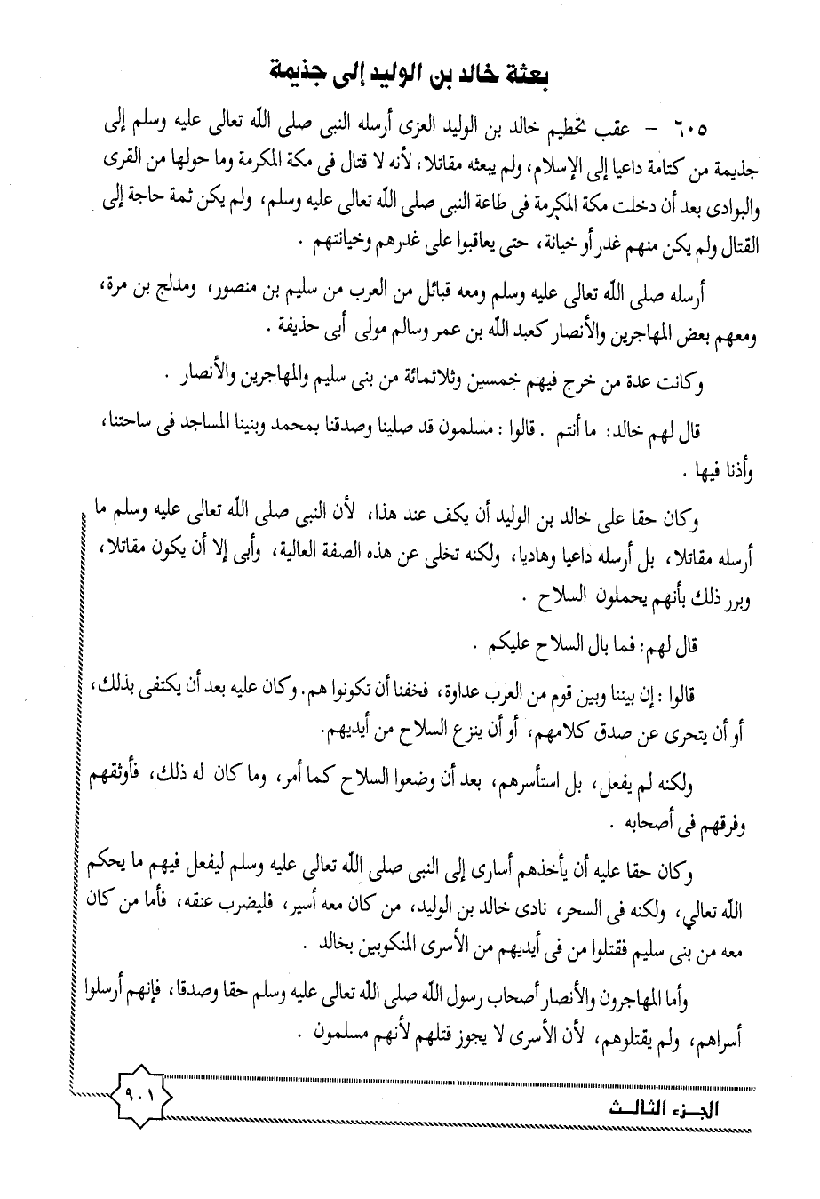 605- عقب تحطيم خالد بن الوليد العزى أرسله النبى صلى الله تعالى عليه وسلم إلى جذيمة من كتامة داعيا إلى الإسلام، ولم يبعثه مقاتلا، لأنه لا قتال فى مكة المكرمة وما حولها من القرى والبوادى بعد أن دخلت مكة المكرمة فى طاعة النبى صلى الله تعالى عليه وسلم، ولم يكن ثمة حاجة إلى القتال ولم يكن منهم غدر أو خيانة، حتى يعاقبوا على غدرهم وخيانتهم.