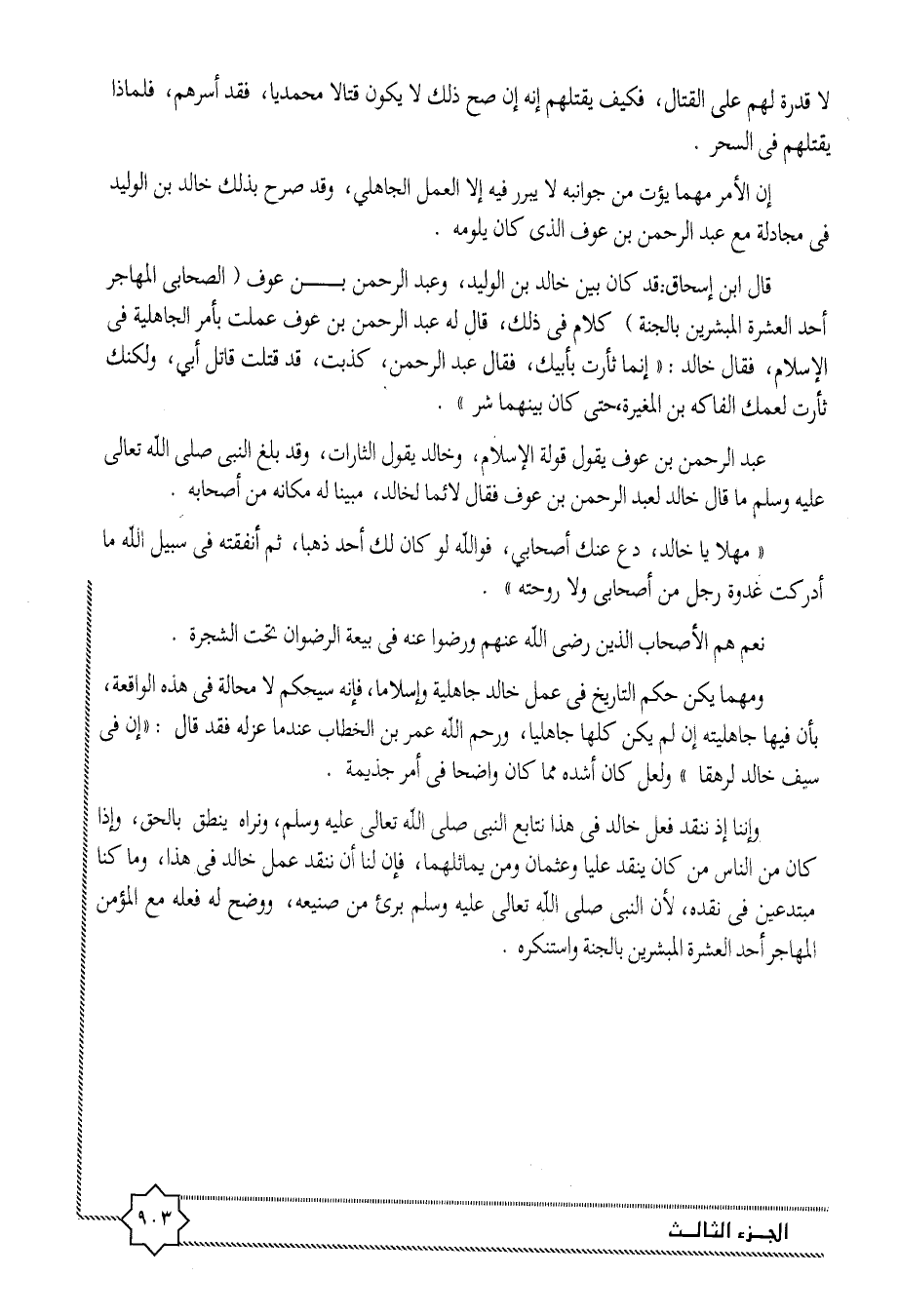 وإننا إذ ننقد فعل خالد فى هذا نتابع النبى صلى الله تعالى عليه وسلم، ونراه ينطق بالحق، وإذا كان من الناس من كان ينقد عليا وعثمان ومن يماثلهما، فإن لنا أن ننقد عمل خالد فى هذا، وما كنا مبتدعين فى نقده، لأن النبى صلى الله تعالى عليه وسلم برئ من صنيعه، ووضح له فعله مع المؤمن المهاجر أحد العشرة المبشرين بالجنة واستنكره.