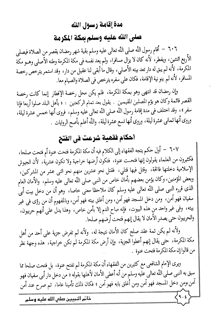606- أقام رسول الله صلى الله تعالى عليه وسلم بقية شهر رمضان يقصر من الصلاة فيصلى الأربع اثنتين، ويفطر، لأنه كان لا يزال مسافرا، ولم يعد نفسه فى مكة المكرمة وطنه الأصلى وهو مكة المكرمة، لأنه لم يبق له دار تعد بيته الأصلي، وقال ما أبقى لنا عقيل من دار، وقد استمر يترخص رخصة المسافر، لأنه لم ينونية الإقامة، فكان على سفره يترخص فى الصلاة والصيام معا.