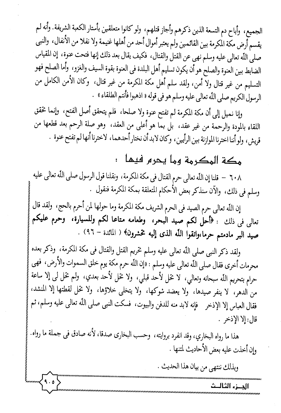 608- قلنا إن الله تعالى حرم القتال فى مكة المكرمة، ونقلنا قول الرسول صلى الله تعالى عليه وسلم فى ذلك، والآن سنذكر بعض الأحكام المتعلقة بمكة المكرمة فنقول.