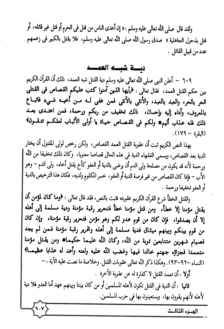 609- أعلن النبى صلى الله تعالى عليه وسلم دية القتل شبه العمد، ذلك أن القرآن الكريم بين حكم القتل العمد، فقال تعالى: يا أَيُّهَا الَّذِينَ آمَنُوا كُتِبَ عَلَيْكُمُ الْقِصاصُ فِي الْقَتْلى الْحُرُّ بِالْحُرِّ، وَالْعَبْدُ بِالْعَبْدِ، وَالْأُنْثى بِالْأُنْثى فَمَنْ عُفِيَ لَهُ مِنْ أَخِيهِ شَيْءٌ فَاتِّباعٌ بِالْمَعْرُوفِ، وَأَداءٌ إِلَيْهِ بِإِحْسانٍ، ذلِكَ تَخْفِيفٌ مِنْ رَبِّكُمْ وَرَحْمَةٌ، فَمَنِ اعْتَدى بَعْدَ ذلِكَ فَلَهُ عَذابٌ أَلِيمٌ. وَلَكُمْ فِي الْقِصاصِ حَياةٌ يا أُولِي الْأَلْبابِ لَعَلَّكُمْ تَتَّقُونَ (البقرة- 179) .