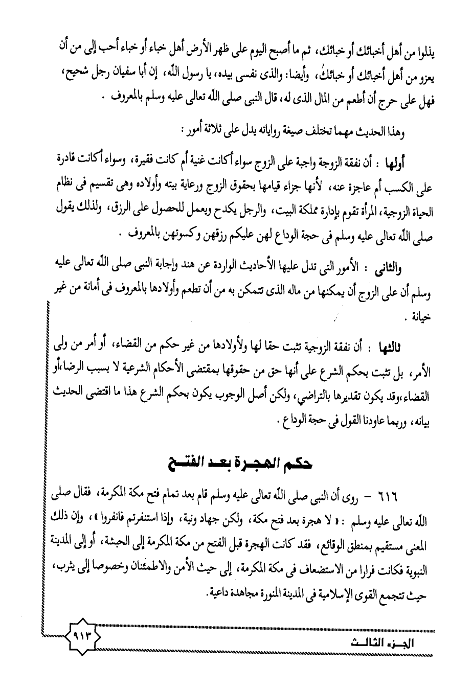ثالثها: أن نفقة الزوجية تثبت حقا لها ولأولادها من غير حكم من القضاء، أو أمر من ولى الأمر، بل تثبت بحكم الشرع على أنها حق من حقوقها بمقتضى الأحكام الشرعية لا بسبب الرضا، أو القضاء، وقد يكون تقديرها بالتراضي، ولكن أصل الوجوب يكون بحكم الشرع هذا ما اقتضى الحديث بيانه، وربما عاودنا القول فى حجة الوداع.